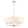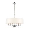 The Nixon 6 light ceiling pendant is finished in a bright nickel plate. The arms are complimented with a touch of crystal and the fitting is topped with a narrow, vintage white, faux silk shades. Height is adjustable, dimmable and suitable for use with LED lamps.