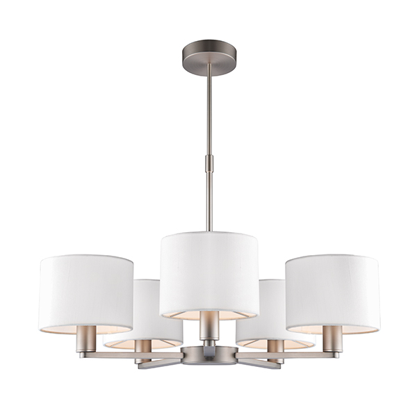 The Daley 5 light pendant is finished in matt nickel with vintage white faux silk shades. This fitting has an adjustable drop, is dimmable and suitable for use with LED lamps.
