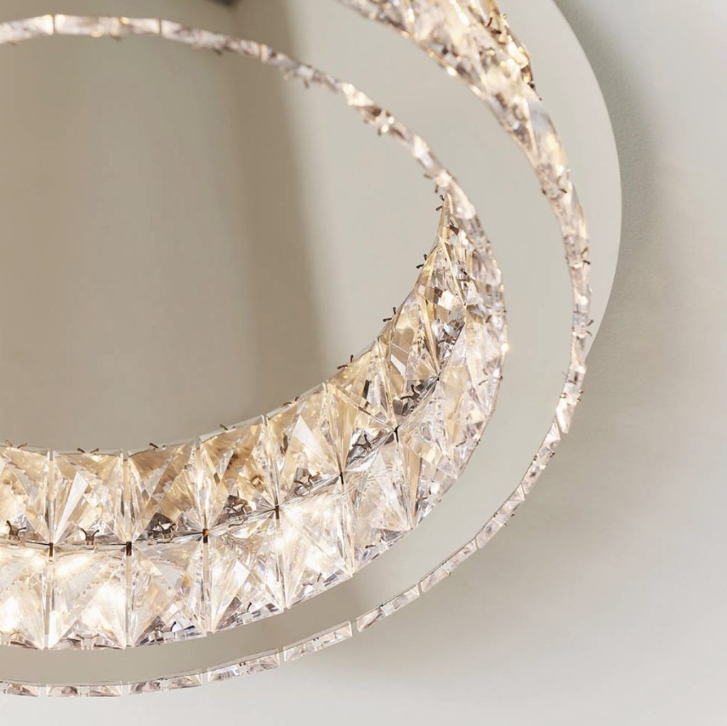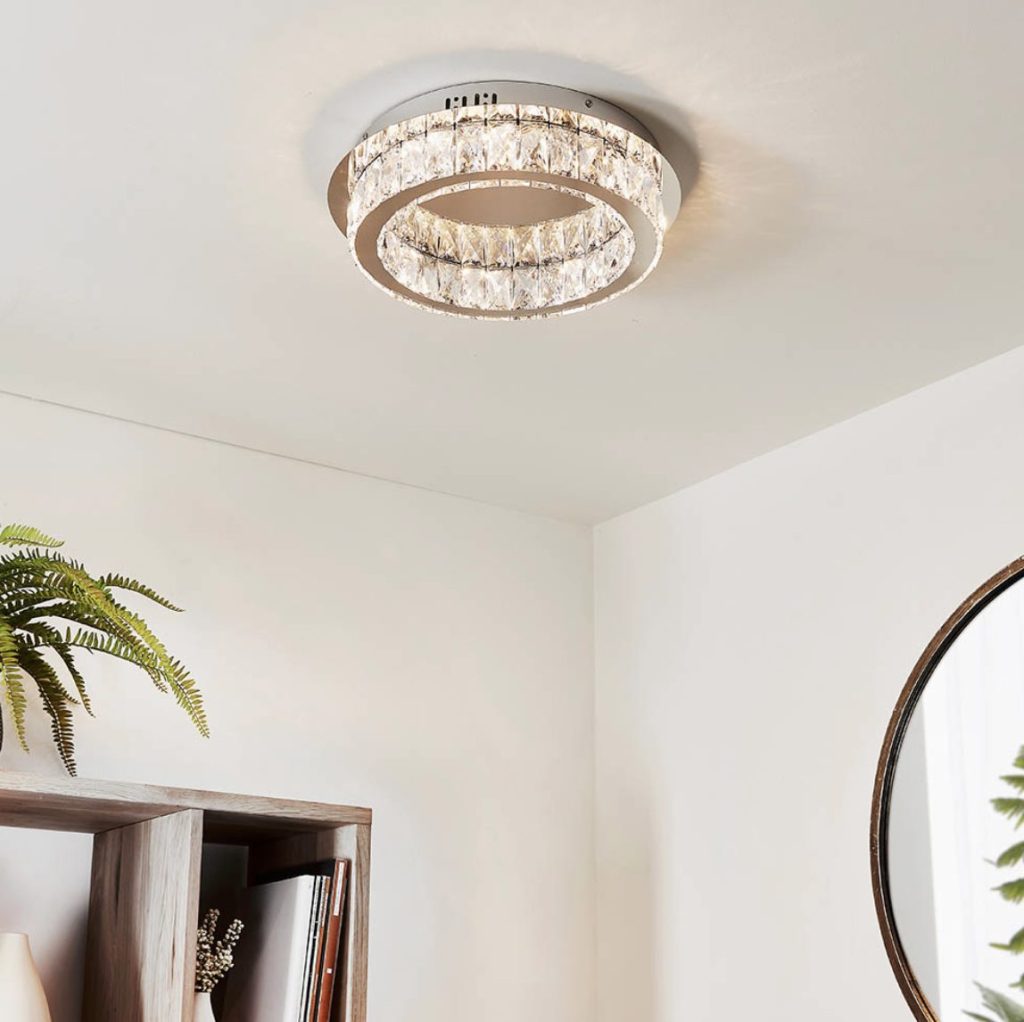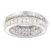 The Swayze is an elaborate flush, finished in chrome with a ring of LED lights diffused through clear faceted acrylic crystals.