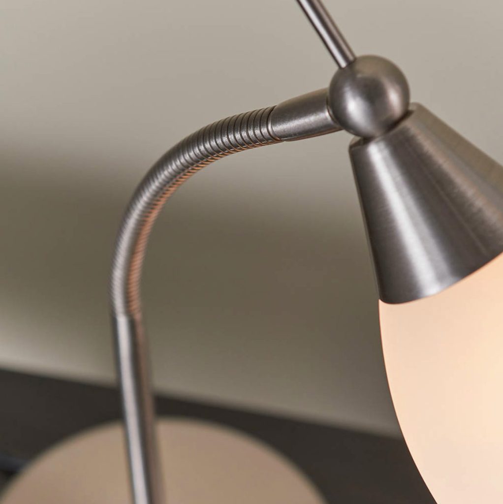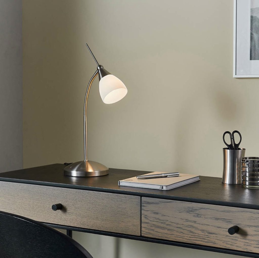 A task table lamp with a satin chrome finish and an opal glass shade. Complete with lamp and touch 3 stage dimmer switch for turning the lamp on and off.