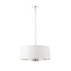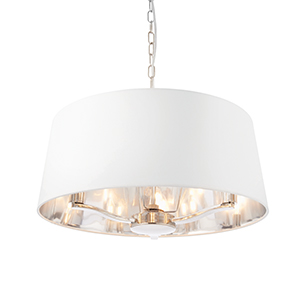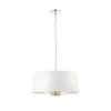 The Harvey 3 light pendant is finished in a bright nickel plate. It is complemented by a silver lined, vintage white, faux silk shade. Dimmable and suitable for use with LED lamps.