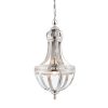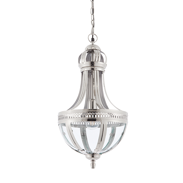 An opulent, eye catching pendant made from brass with a bright nickel plate and clear glass. Compatible with LED lamps and dimmable.