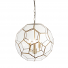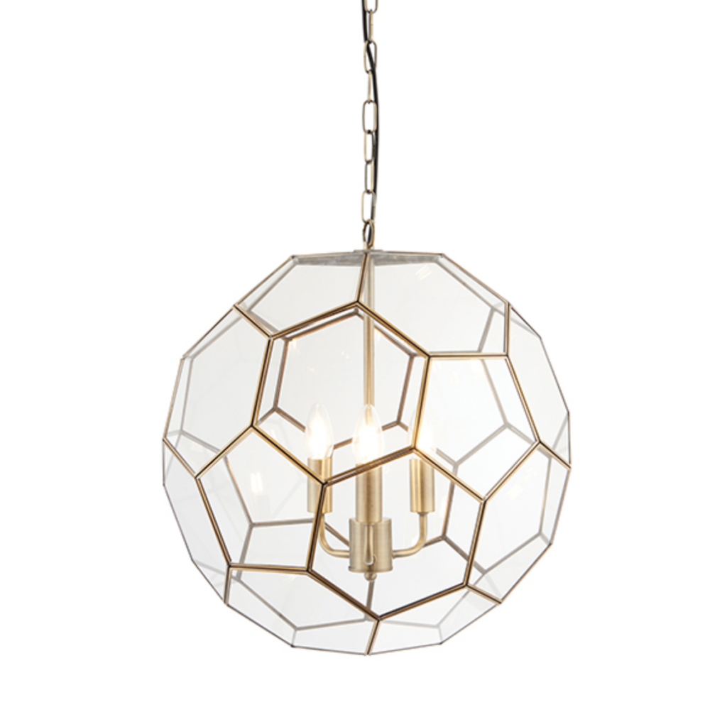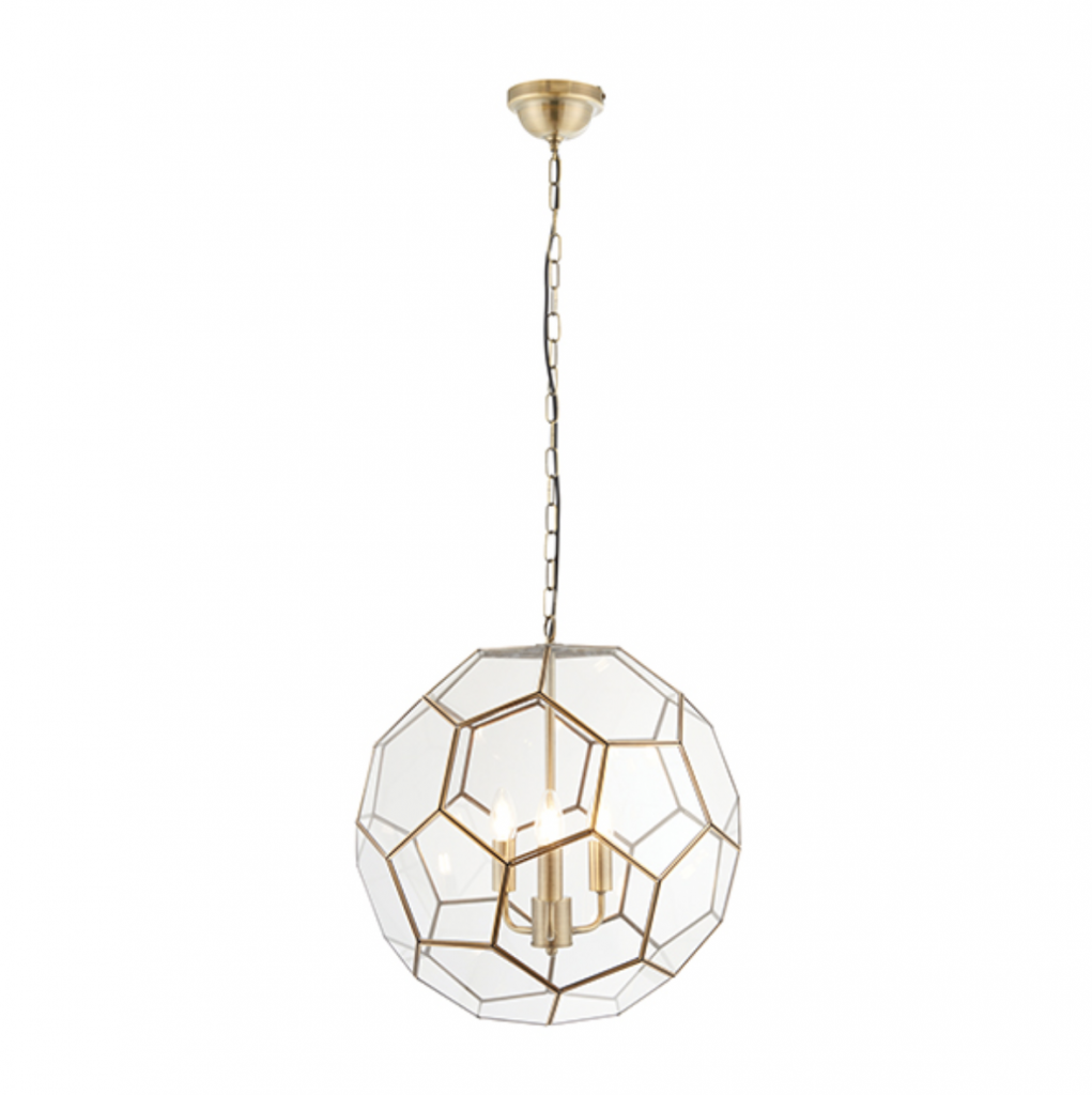 The Miele 3 light pendant has a striking design, incorporating hexagonal glass panels edged in antique brass. Suspended from a decorative chain, dimmable and suitable for use with LED lamps.