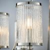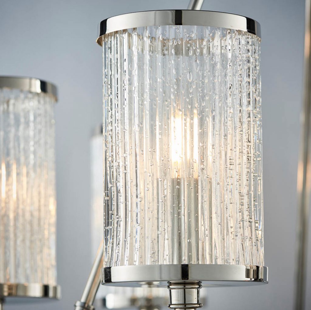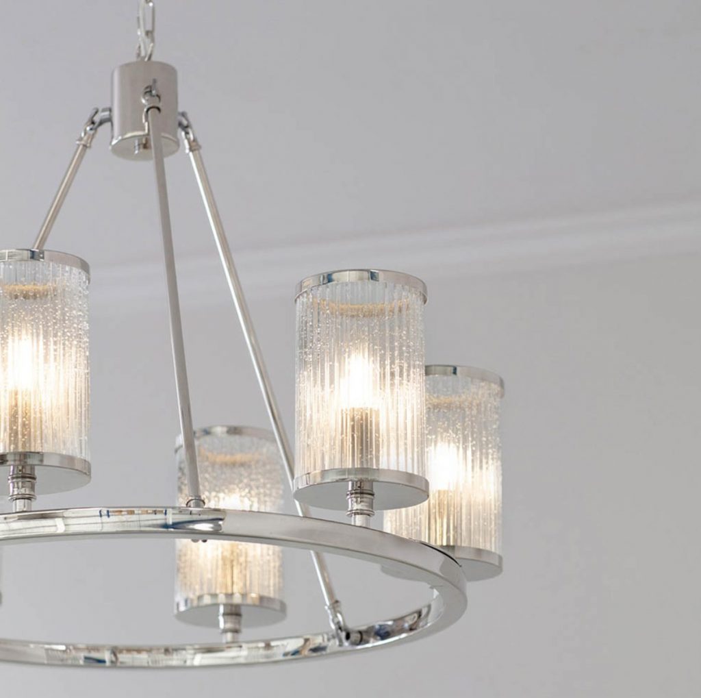 A unique classic styled chandelier in bright nickel plated finish. Inspired by hurricane lamps, the clear ribbed glass shades with bubble details create a perfect diffused light when lit by filament LED lamps. Each shade rests subtly on the rectangular section hoop and is suspended by three fixed arms with a height adjustable chain & clear flex set.