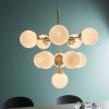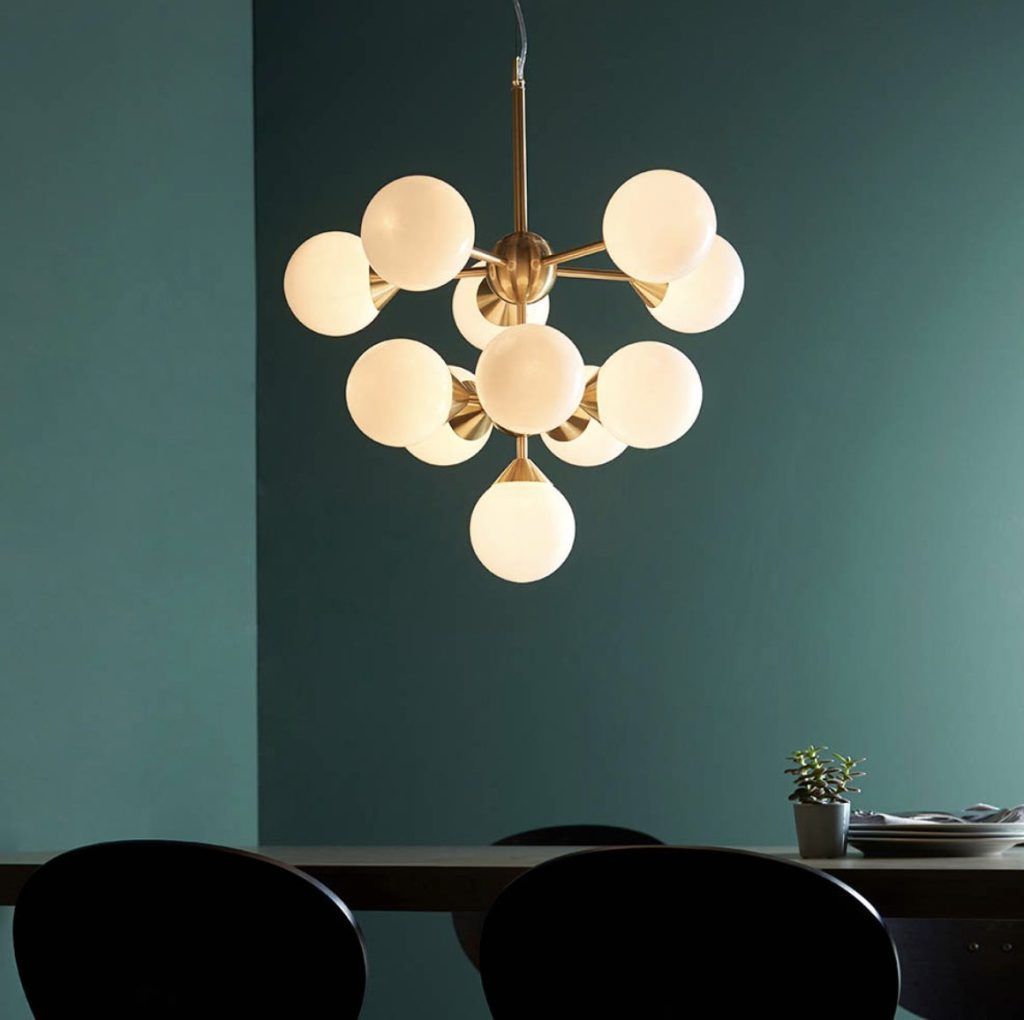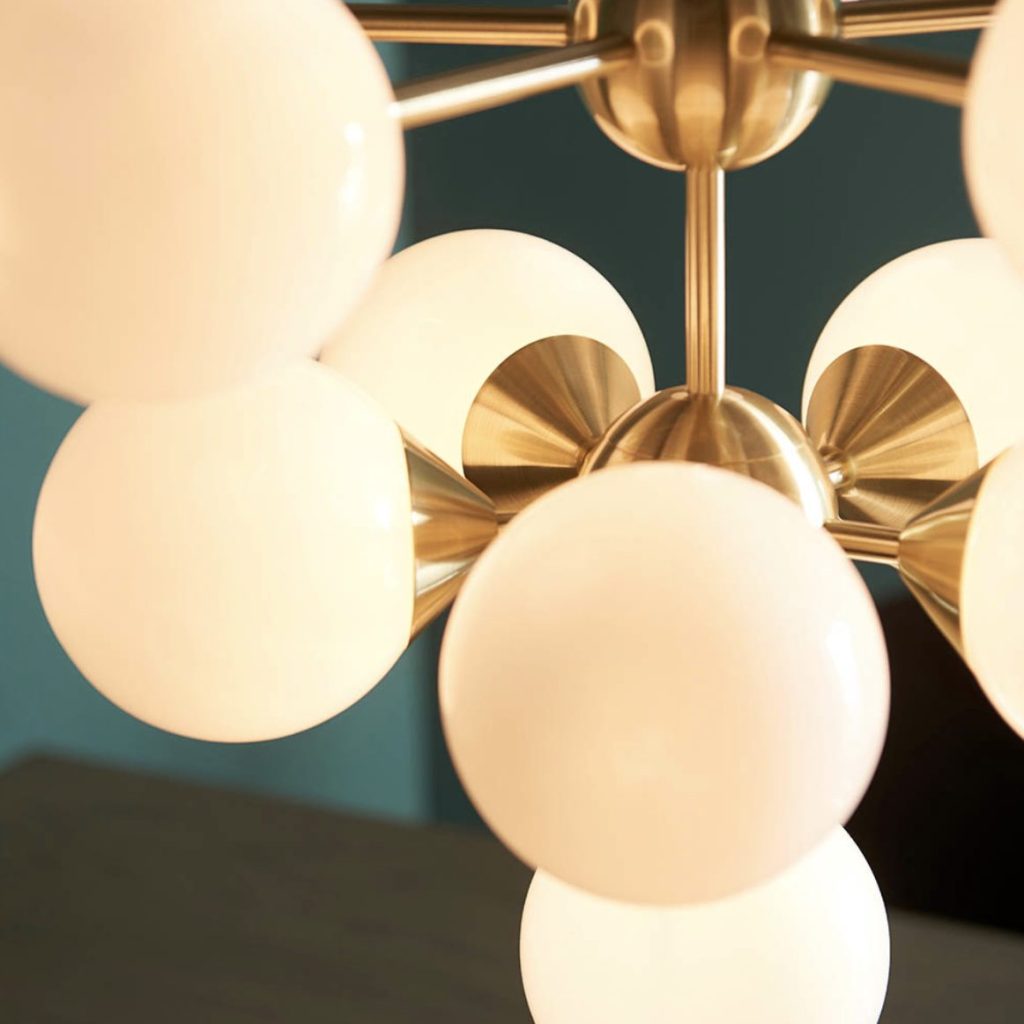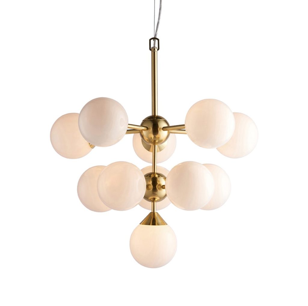 A timeless and modern design with a ‘mid-century’ feel, this impressive pendant is at home in modern or classic interiors. Finished in an ‘on-trend’ brushed brass finish with gloss white glass shades and suspended from height adjustable thin wire cable with clear flex.