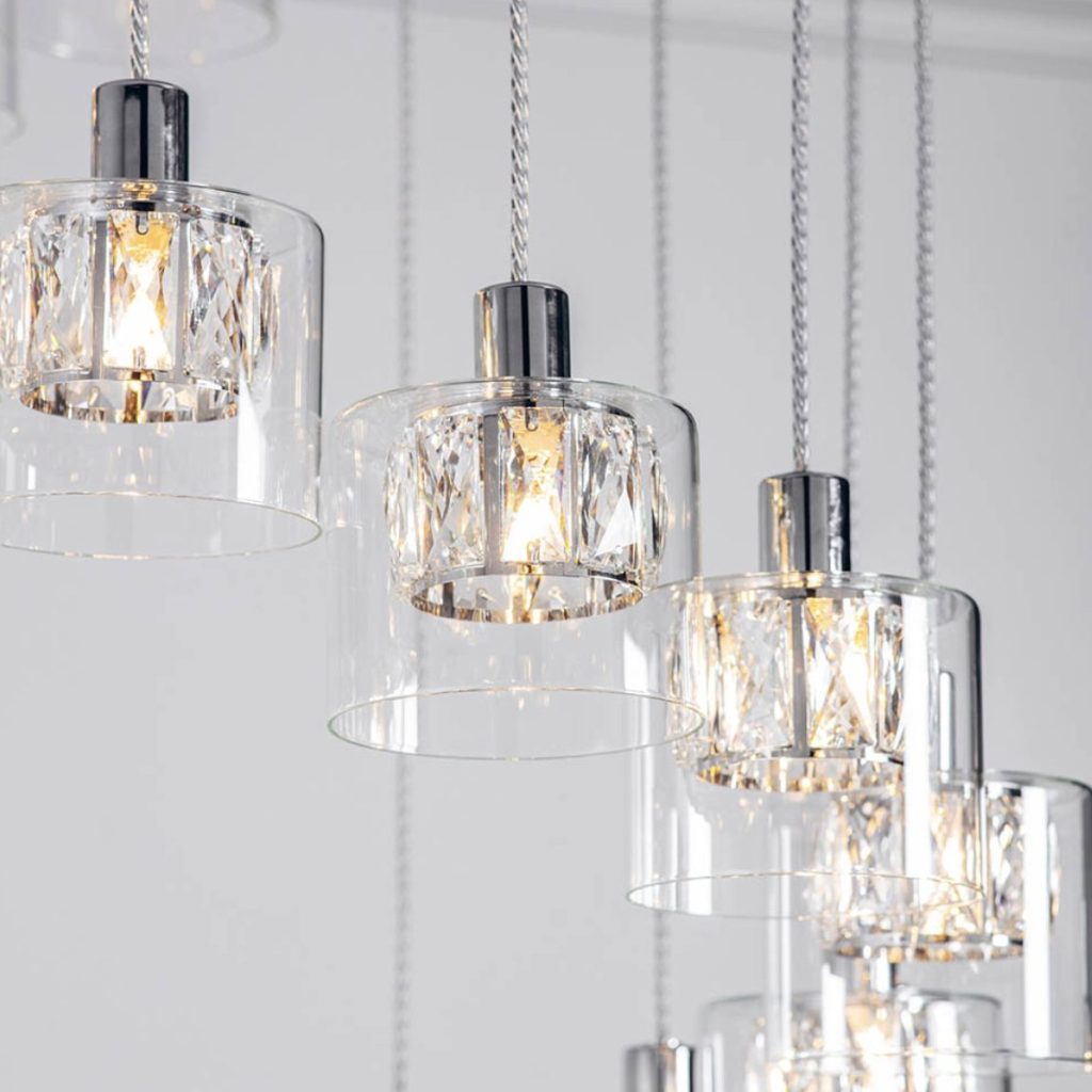 High quality clear crystals adorn this deluxe chrome plated multi pendant, the crystal shades are enclosed by beautiful clear glass diffusers, each suspended on height adjustable clear flex. The combination of clear crystals, polished chrome and glass create a luxurious interior decorative pendant light.