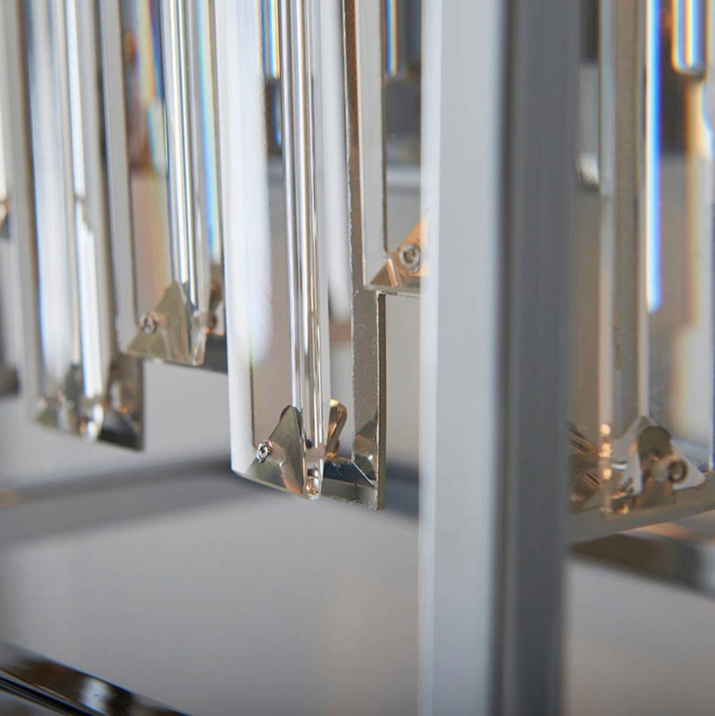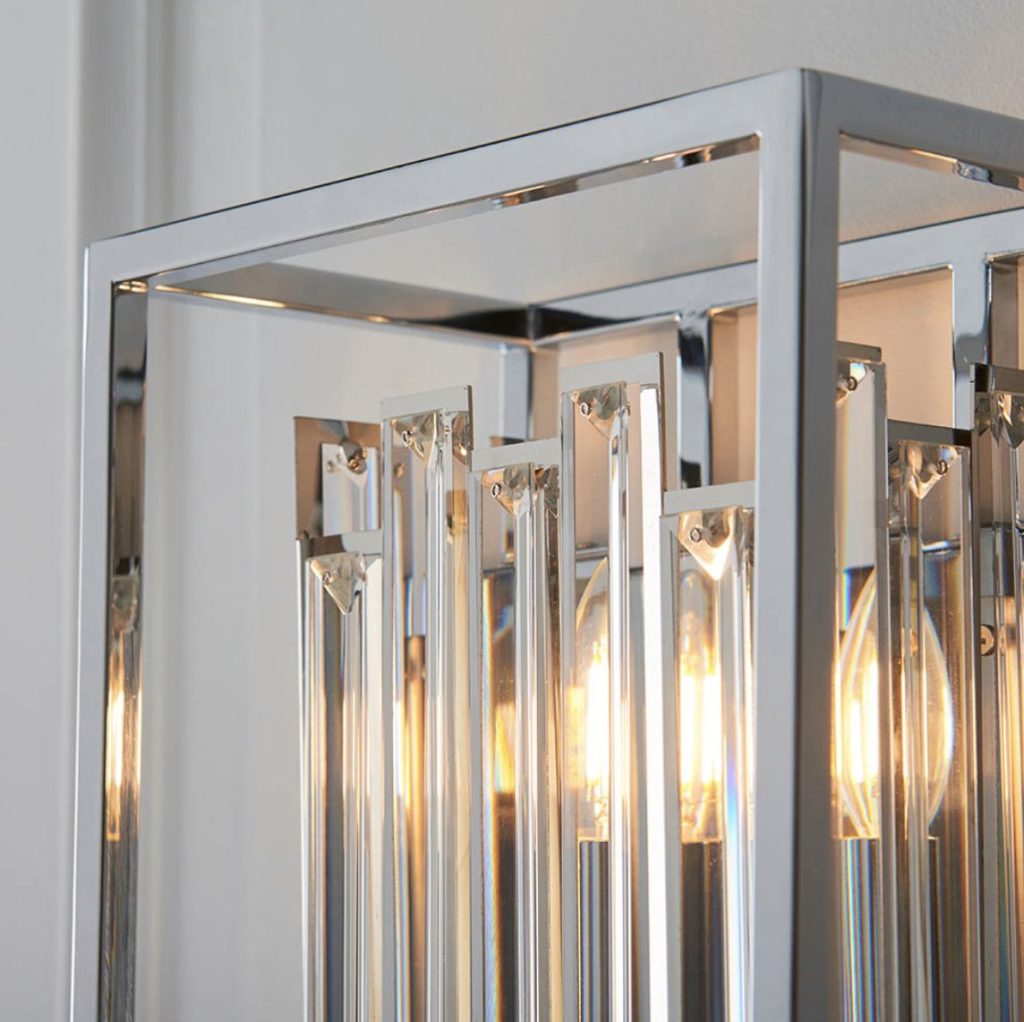 A striking mix of modern and classic styling, high quality bevelled glass crystals are effortlessly framed within modern polished chrome metalwork, the perfect touch of opulent style and on-trend design.