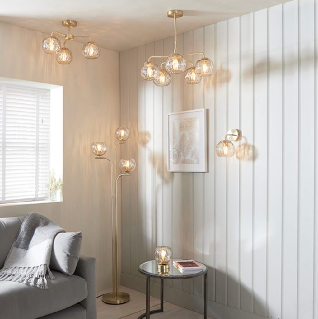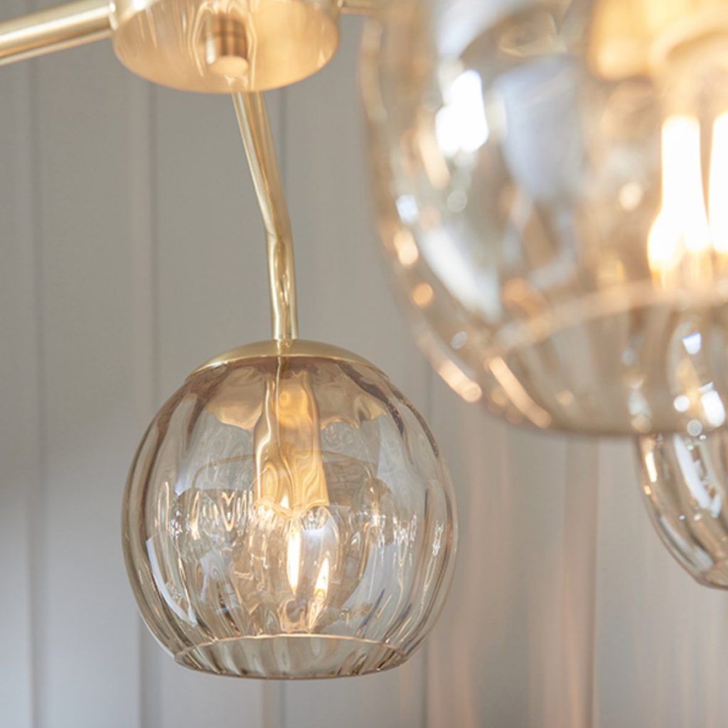 Champagne lustre glass meets modern brushed brass plating in a combination of modern classic styling. This adjustable drop ceiling light is the perfect addition to your modern home.