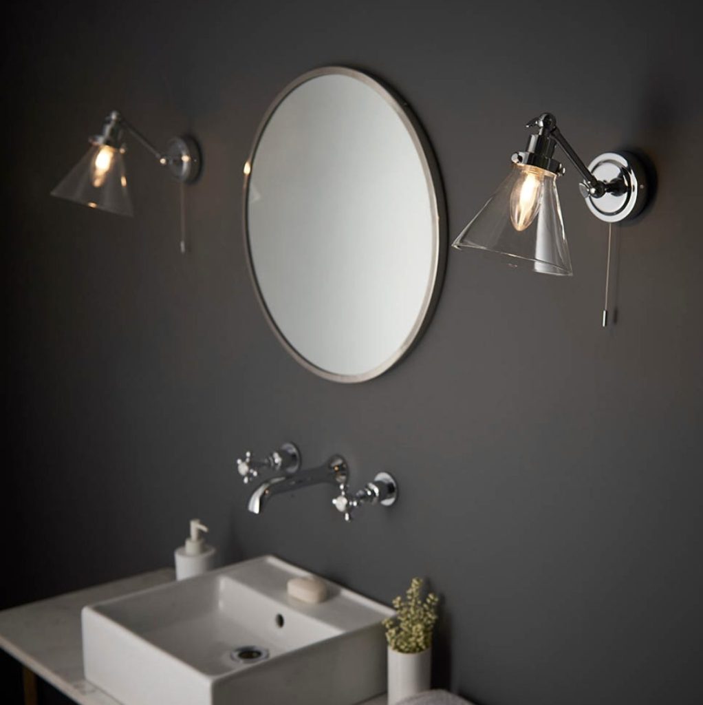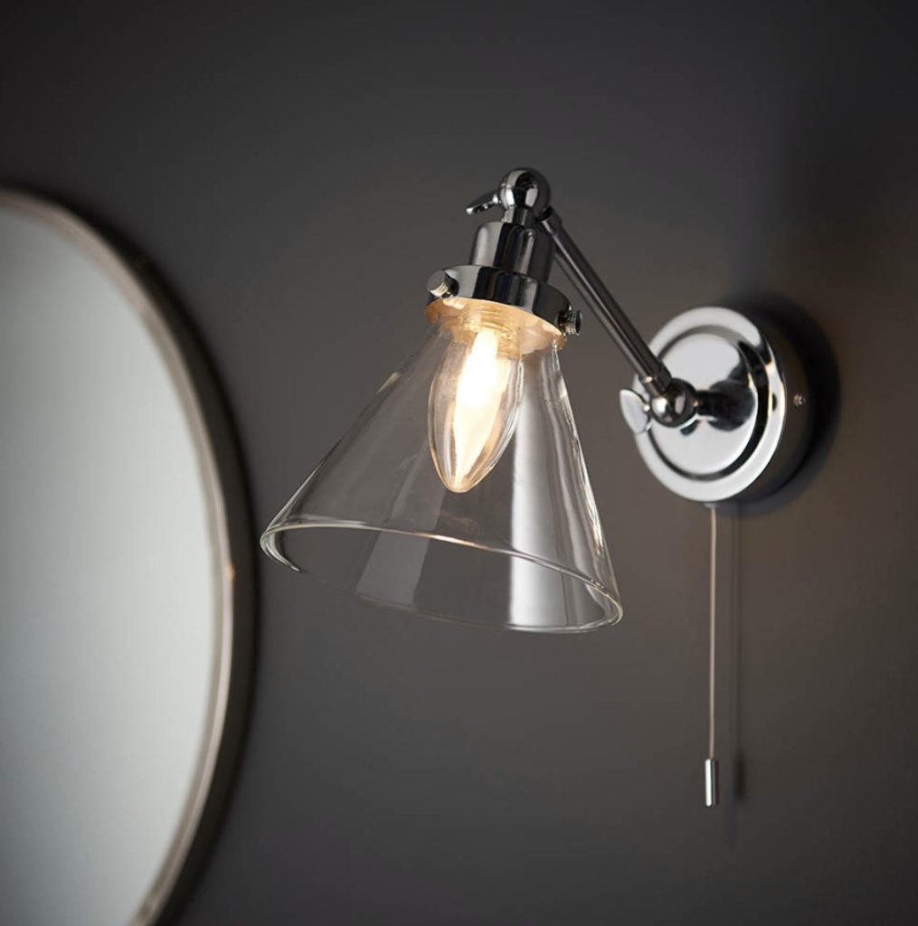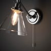 Contemporary style wall light with clear glass shade and chrome plated metalwork. Adjustable head for angled lighting and easy to reach on/off pull cord switch.
