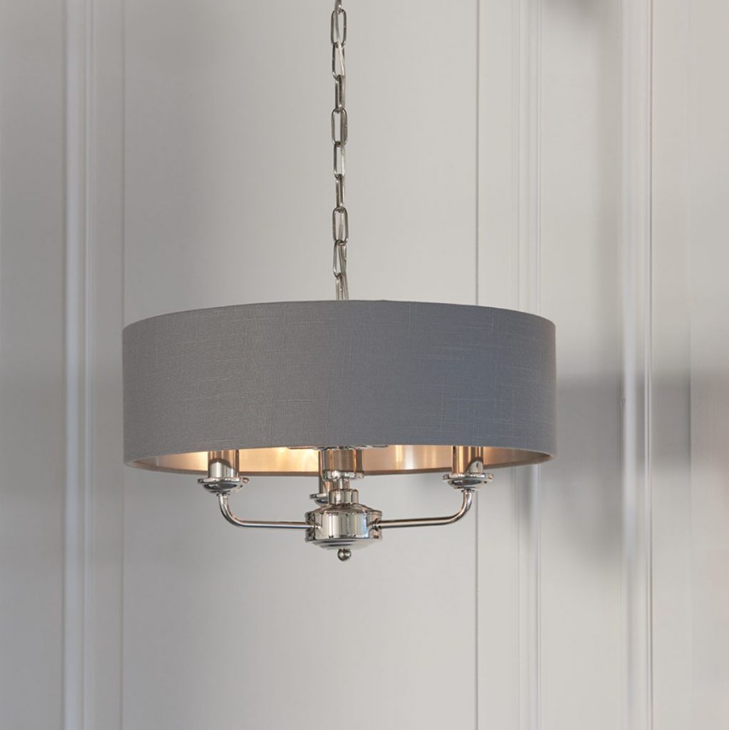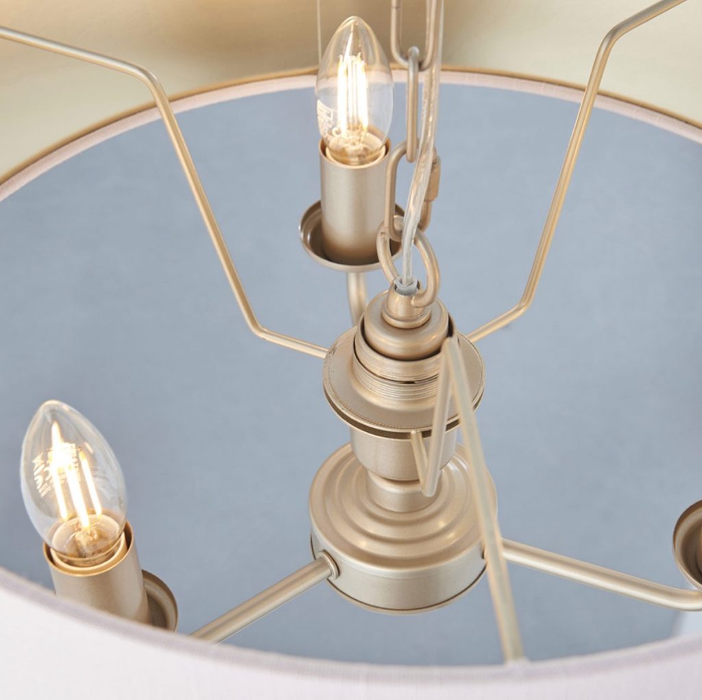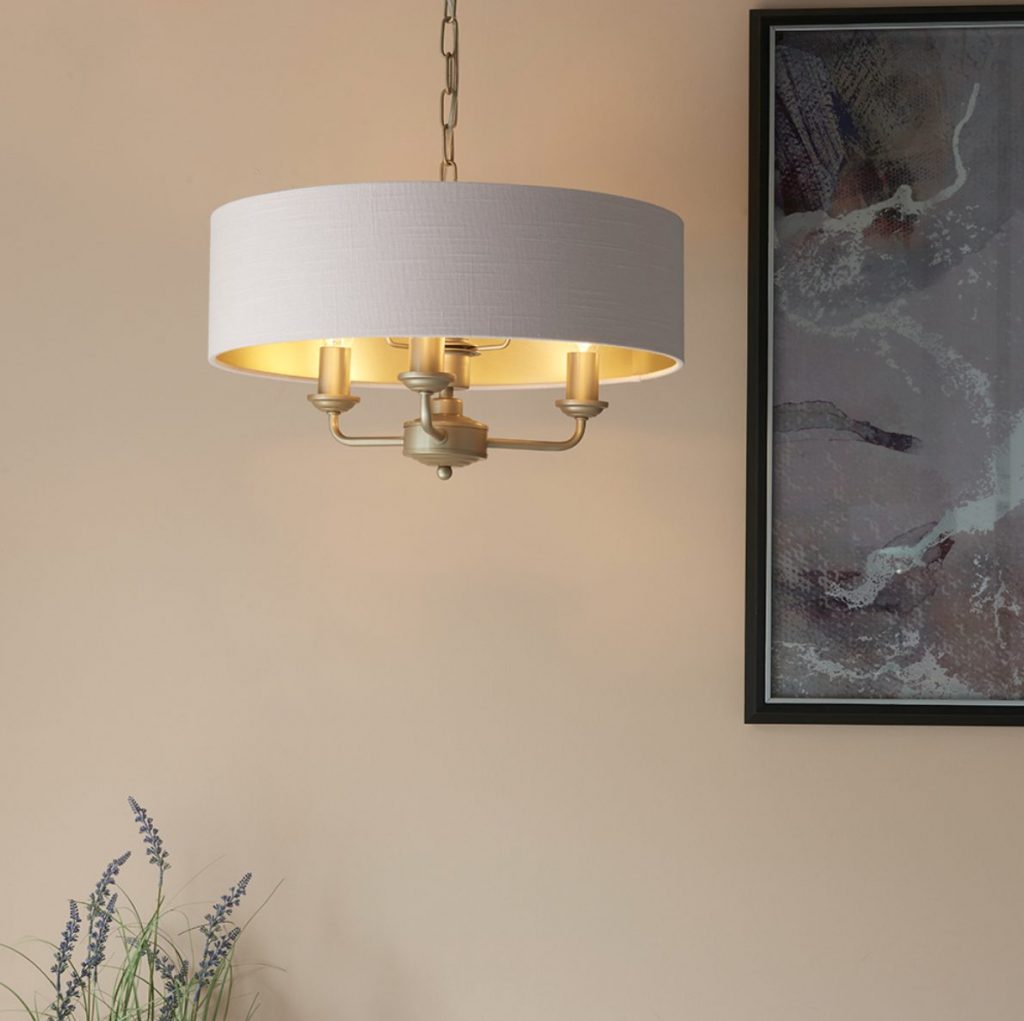 The Highclere pendant is a sophisticated combination of linen mix fabric with reflective metallic inner and plated metalwork. This statement light is the perfect timeless addition to modern and classic homes of today.