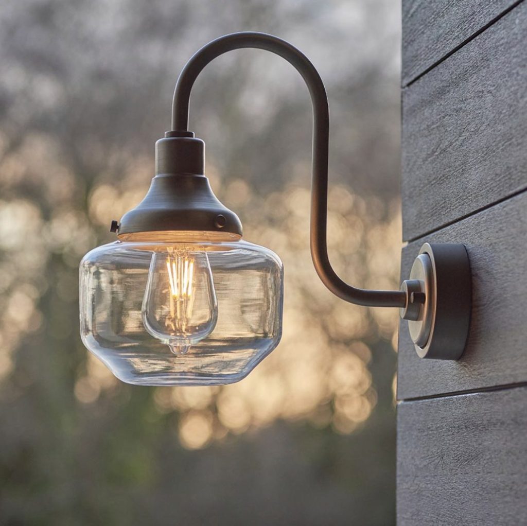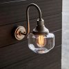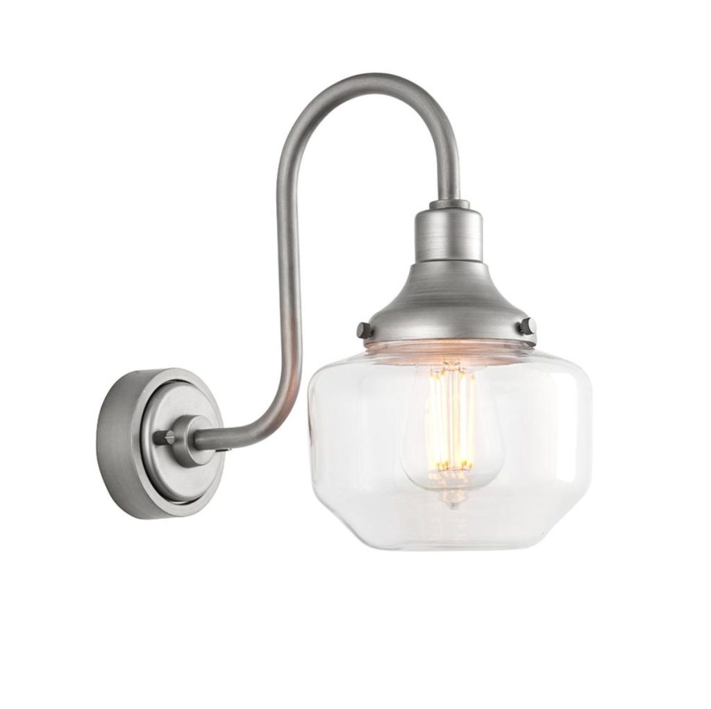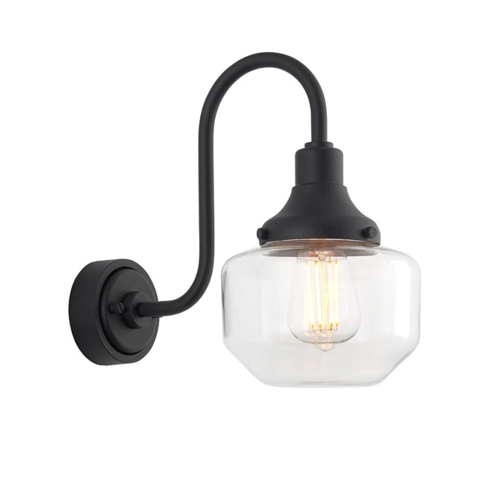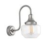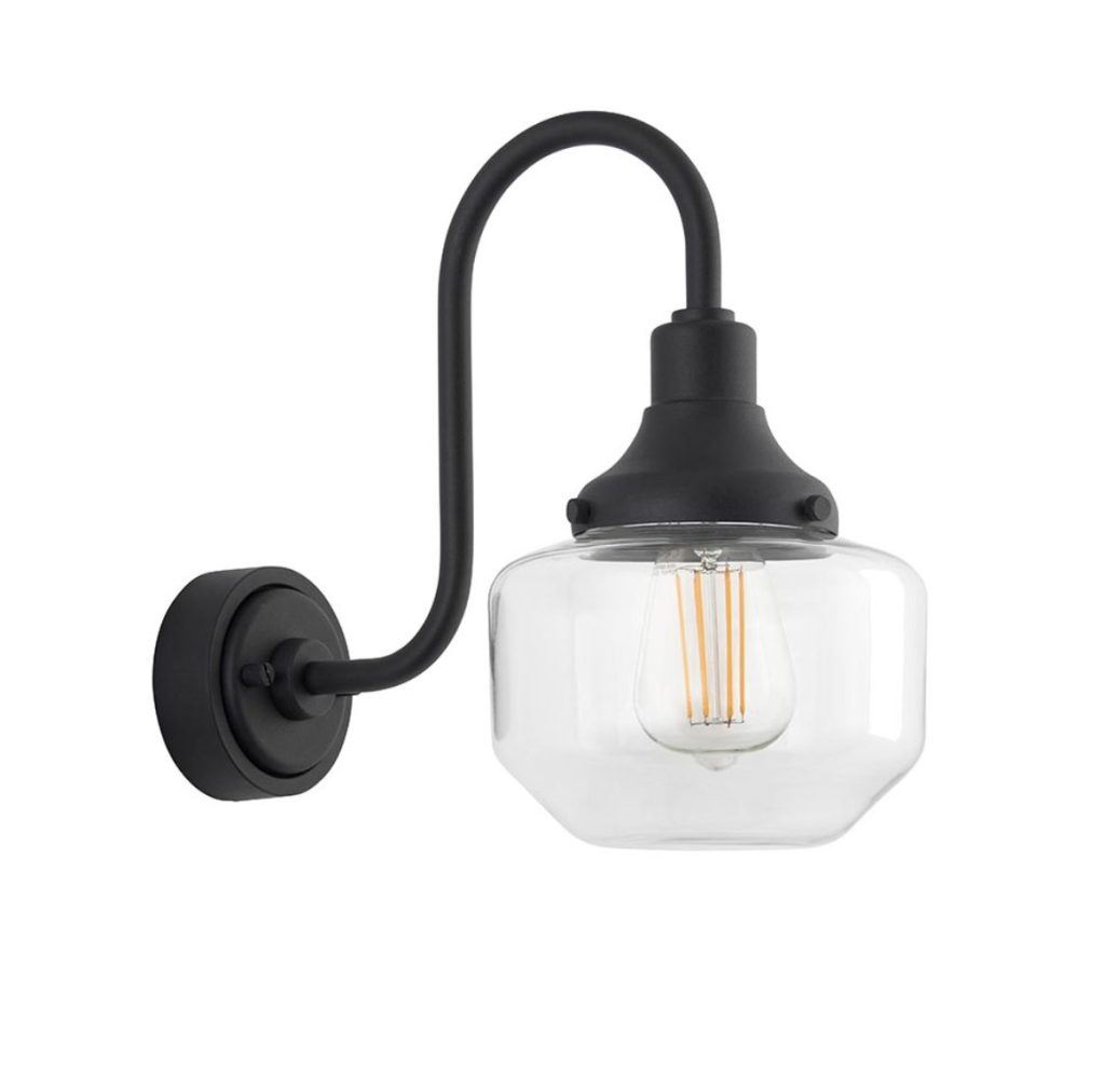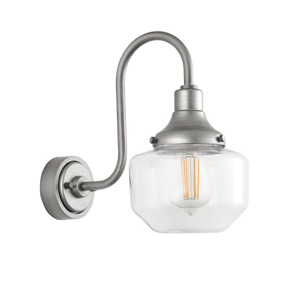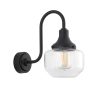 Textured Black or Aged Pewter swan neck wall light with clear glass shade. Weather resistant die cast aluminium & steel. Brushed silver painted metalwork. Clear glass shade.