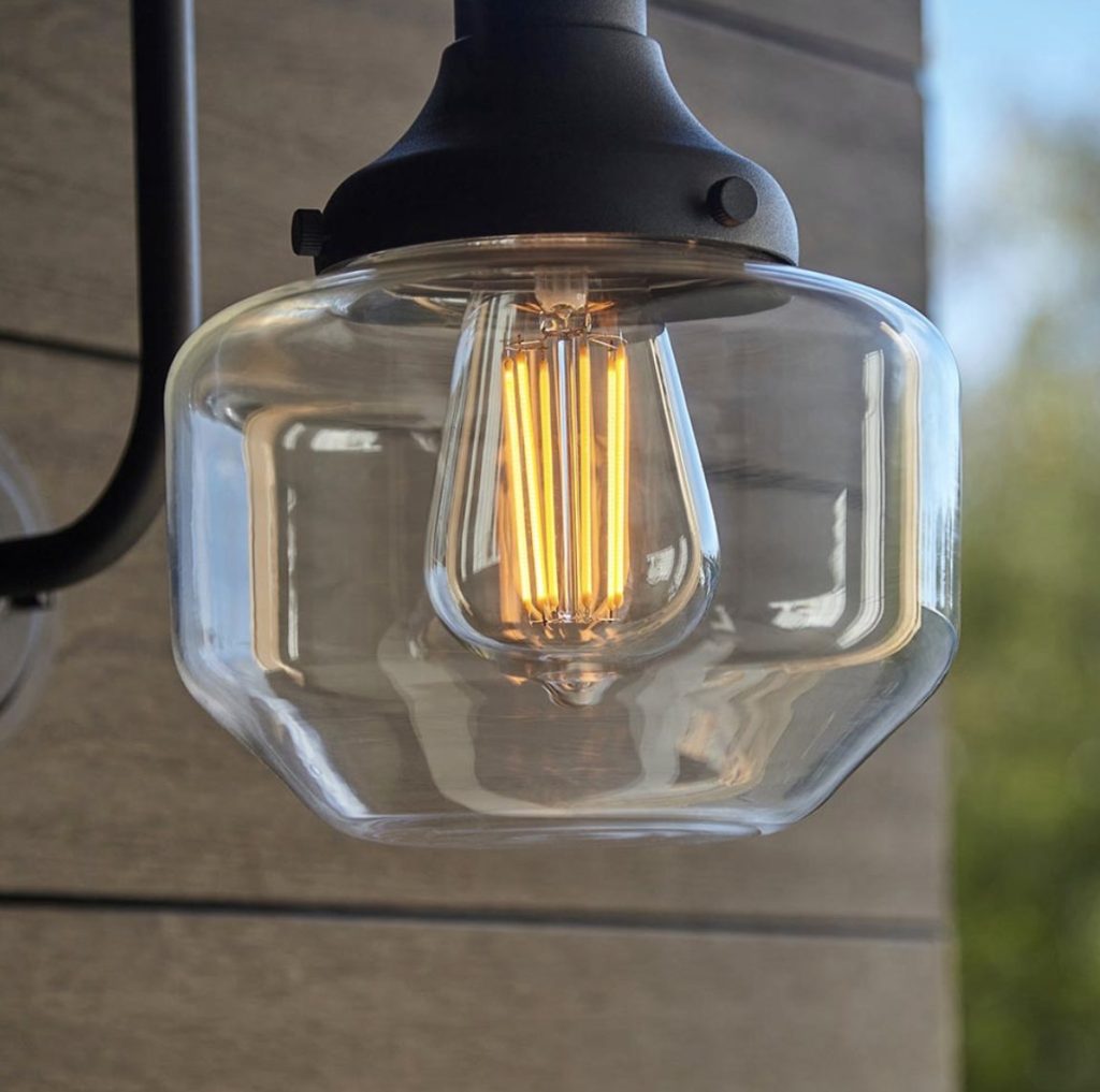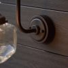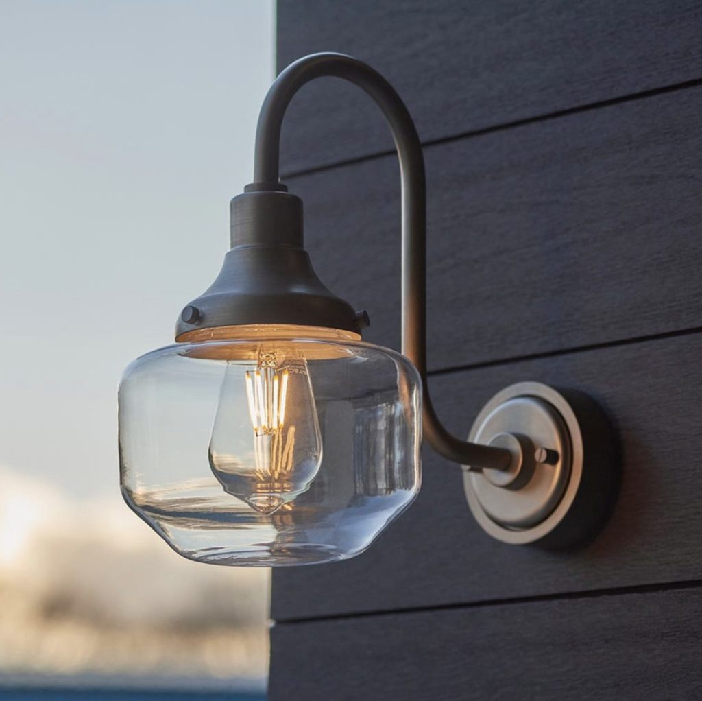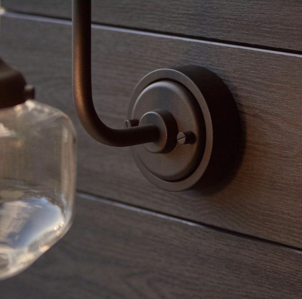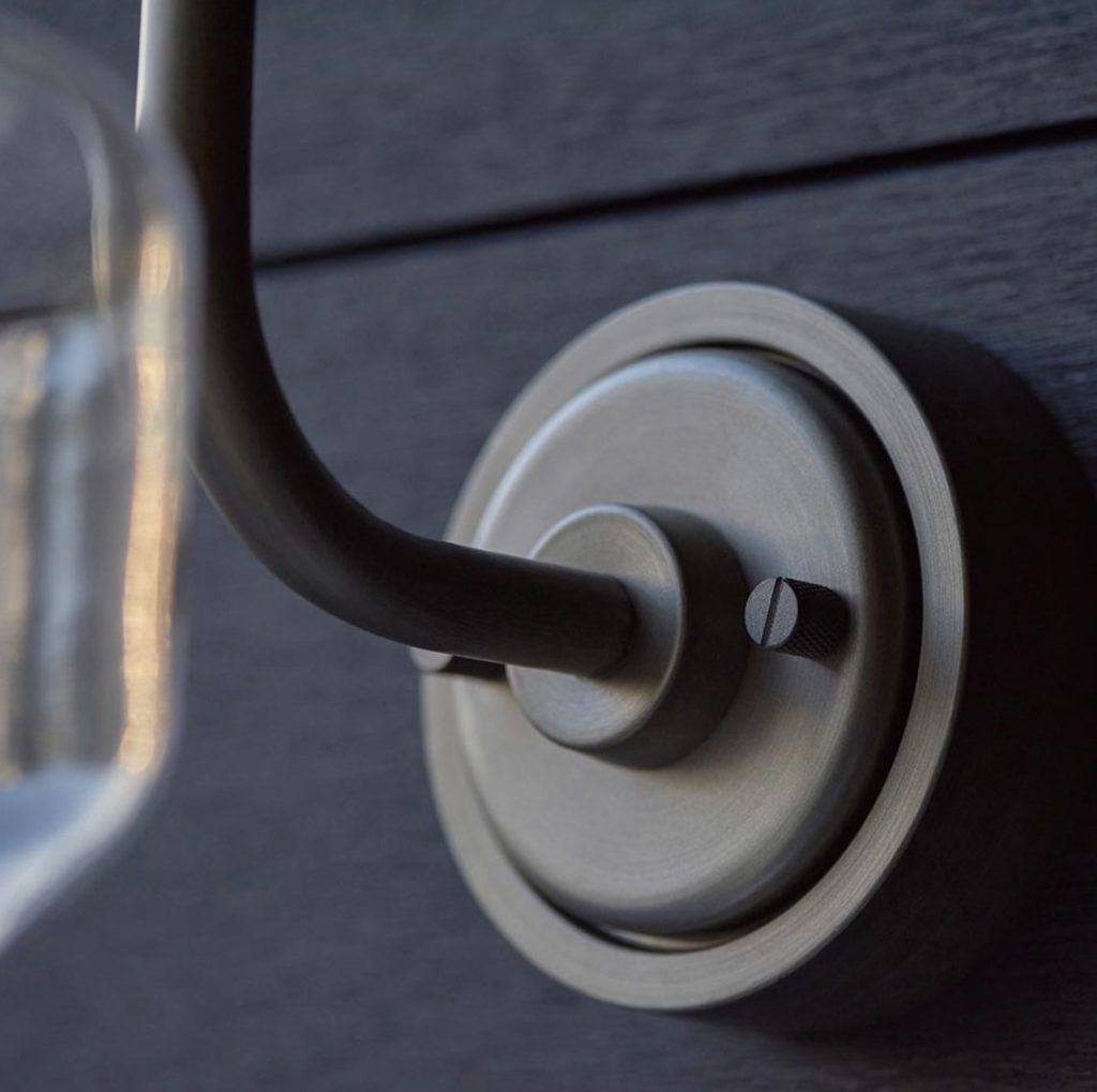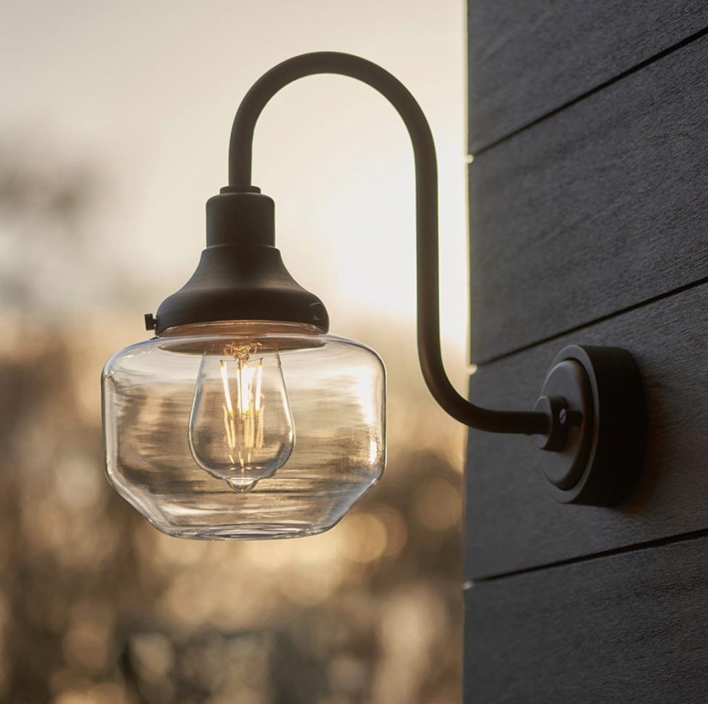 Textured Black or Aged Pewter swan neck wall light with clear glass shade. Weather resistant die cast aluminium & steel. Brushed silver painted metalwork. Clear glass shade.