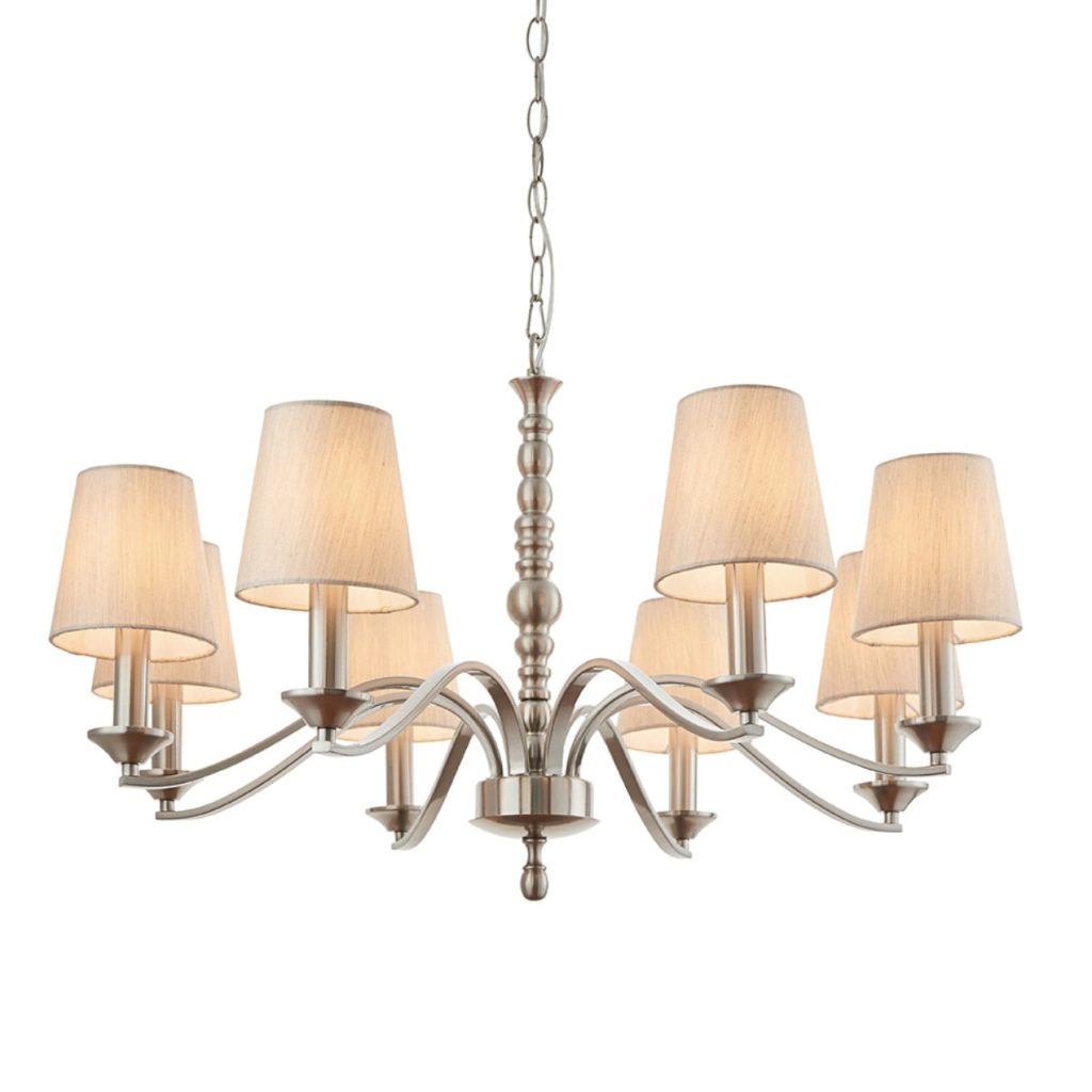 An 8 light ceiling fitting finished in satin nickel and complimented by natural cotton shades. Height is adjustable at time of fitting with a drop of up to 1520mm. It is both dimmable and suitable for use with LED lamps.