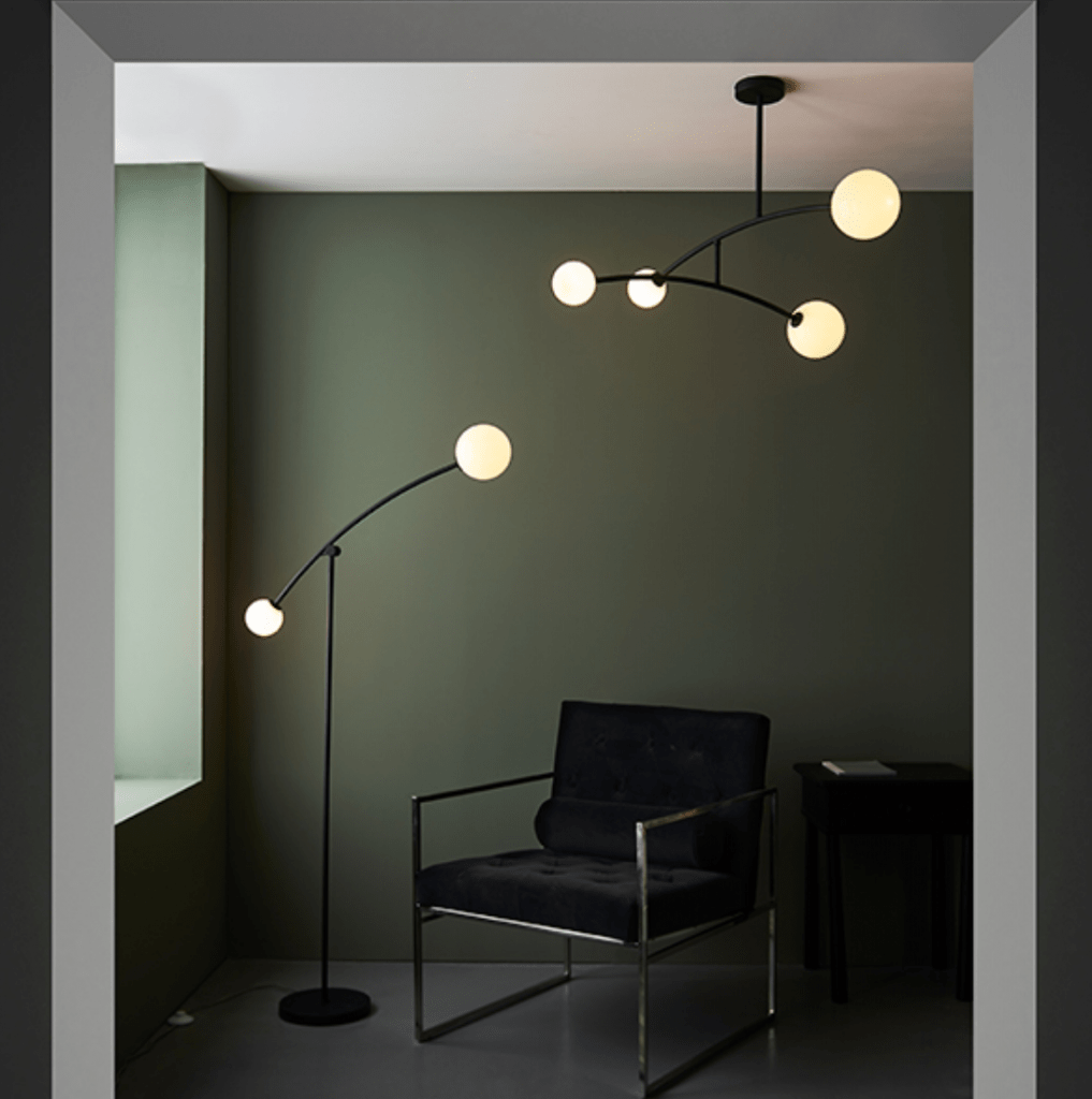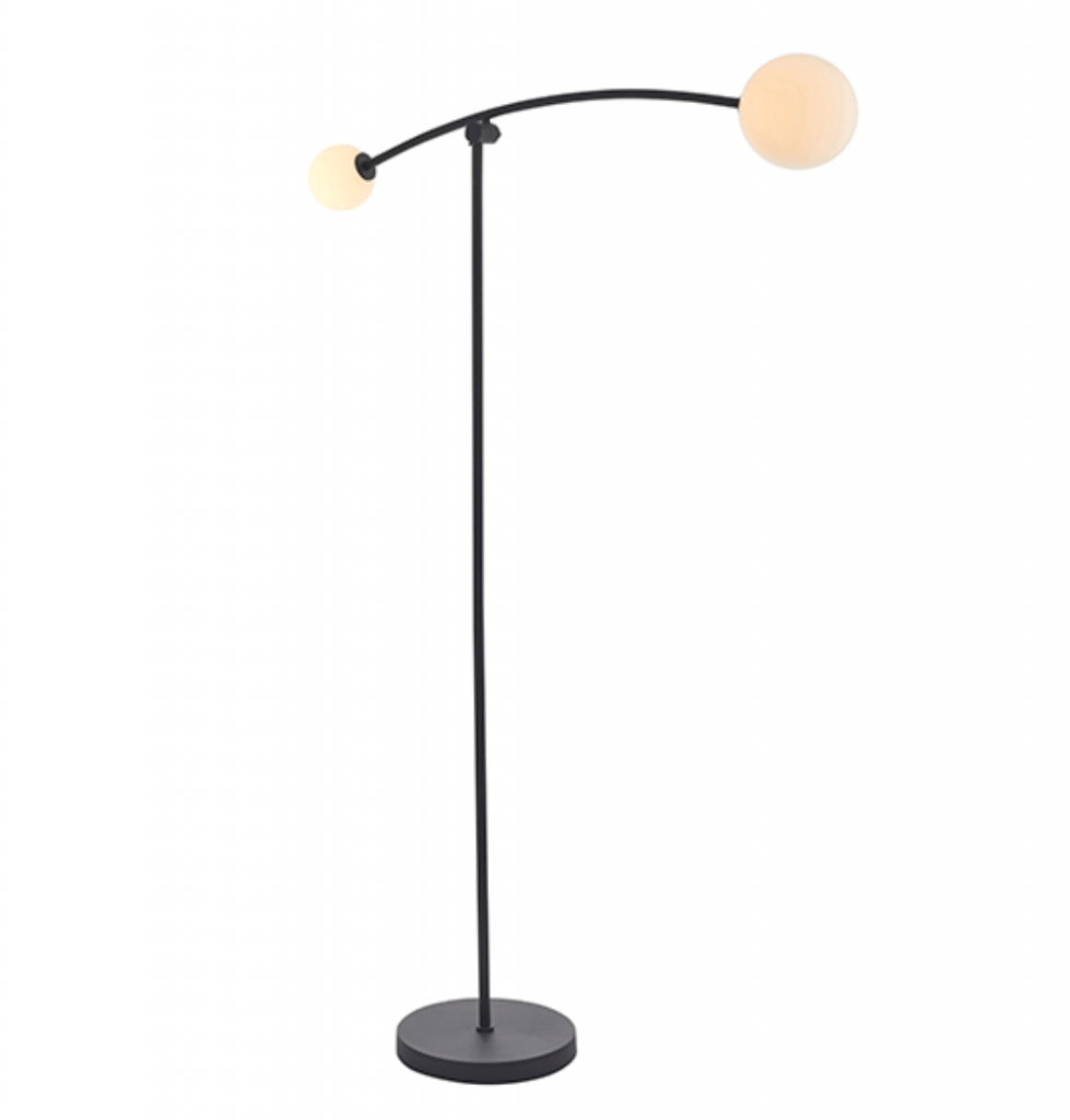 Textured Matt Black painted floor lamp with 2 gloss opal spherical glass shades. Adjustable height arm. In-line foot on/off switch with 2 metre grey fabric flex.