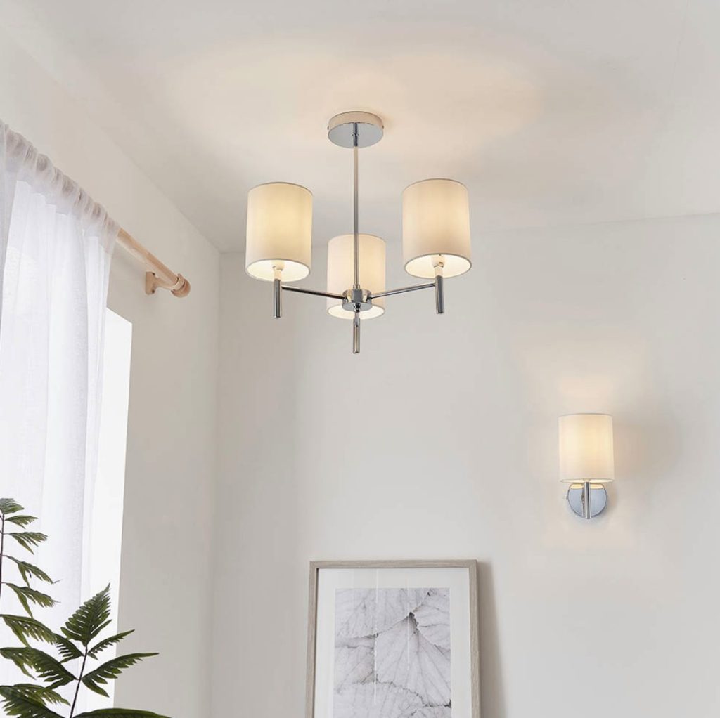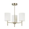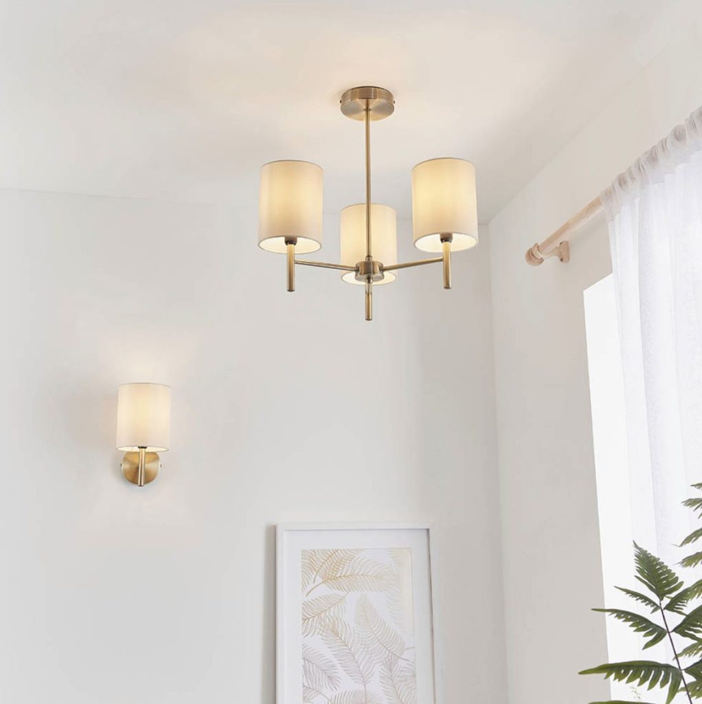 This 3 light ceiling fitting has an antique brass finish and is complemented with 3 cream faux silk shades. suitable for use with LED lamps and dimmable.