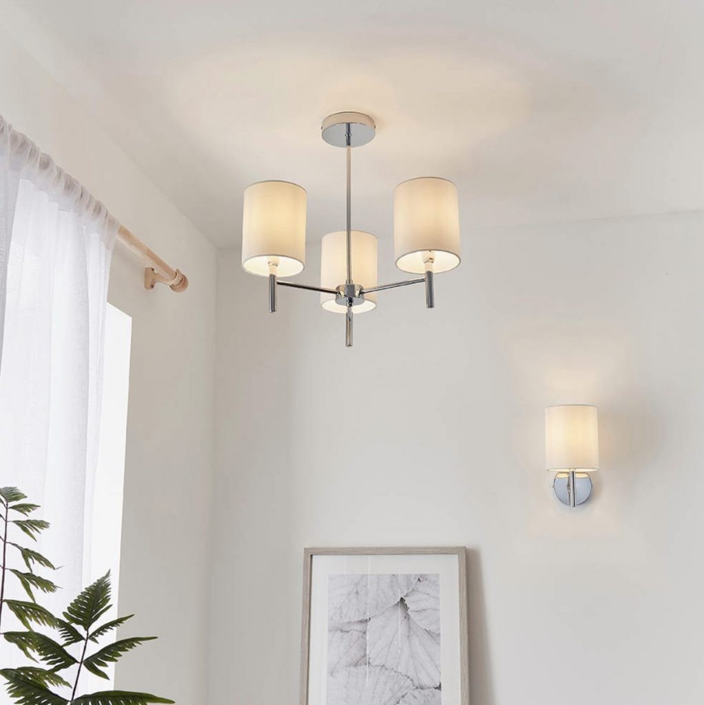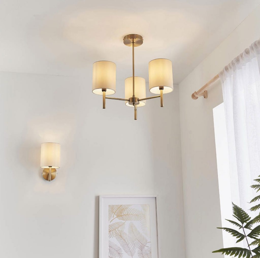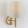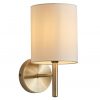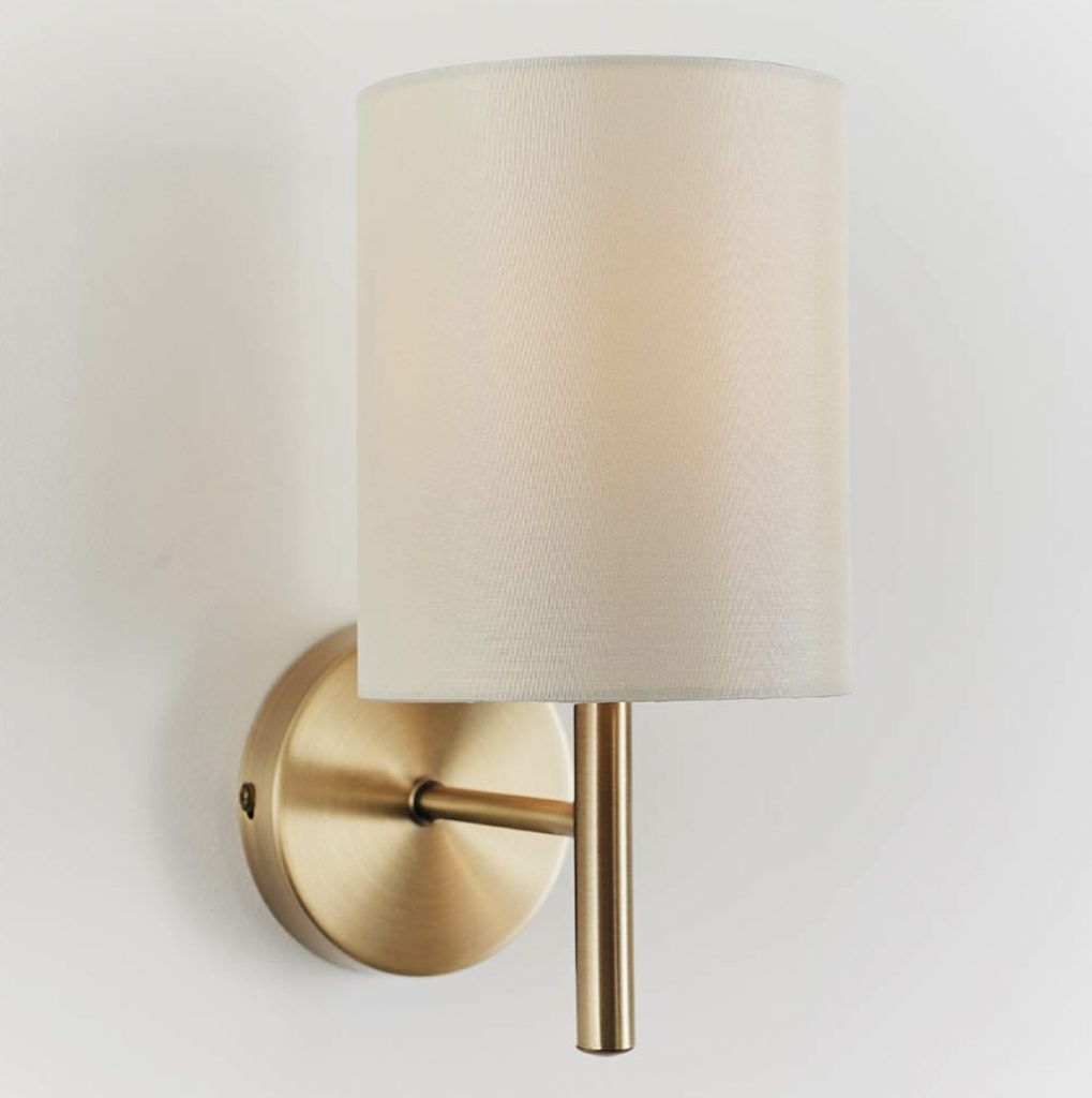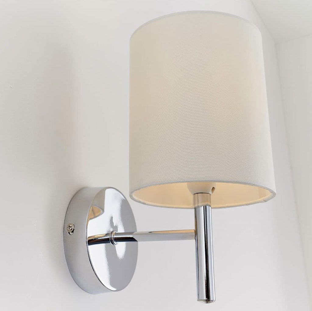 This wall light has an Antique Brass or Polished Chrome finish and is complemented with a cream or off-white faux silk shade.