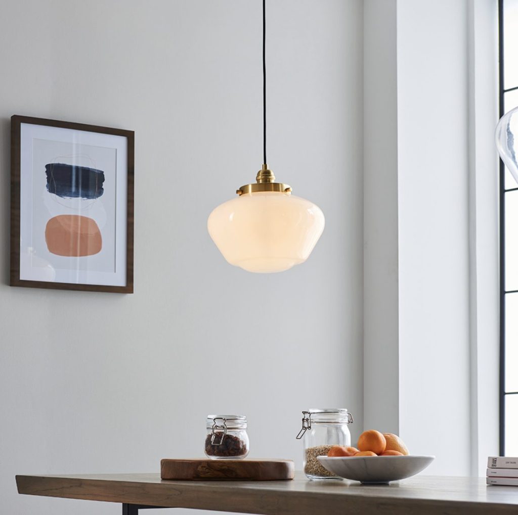 A timeless styled pendant in brass with opal glass, ideal for the kitchen, above a breakfast bar or dining table.
