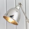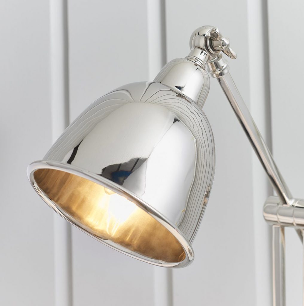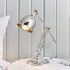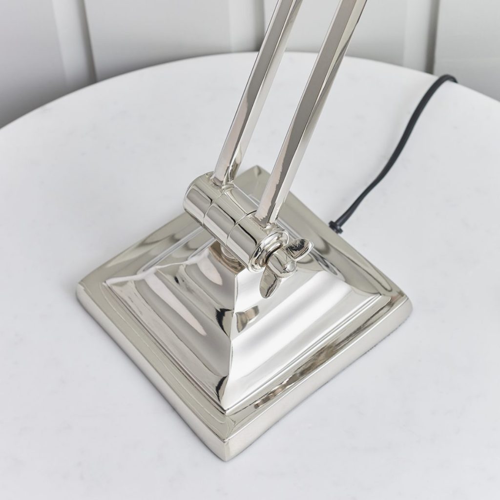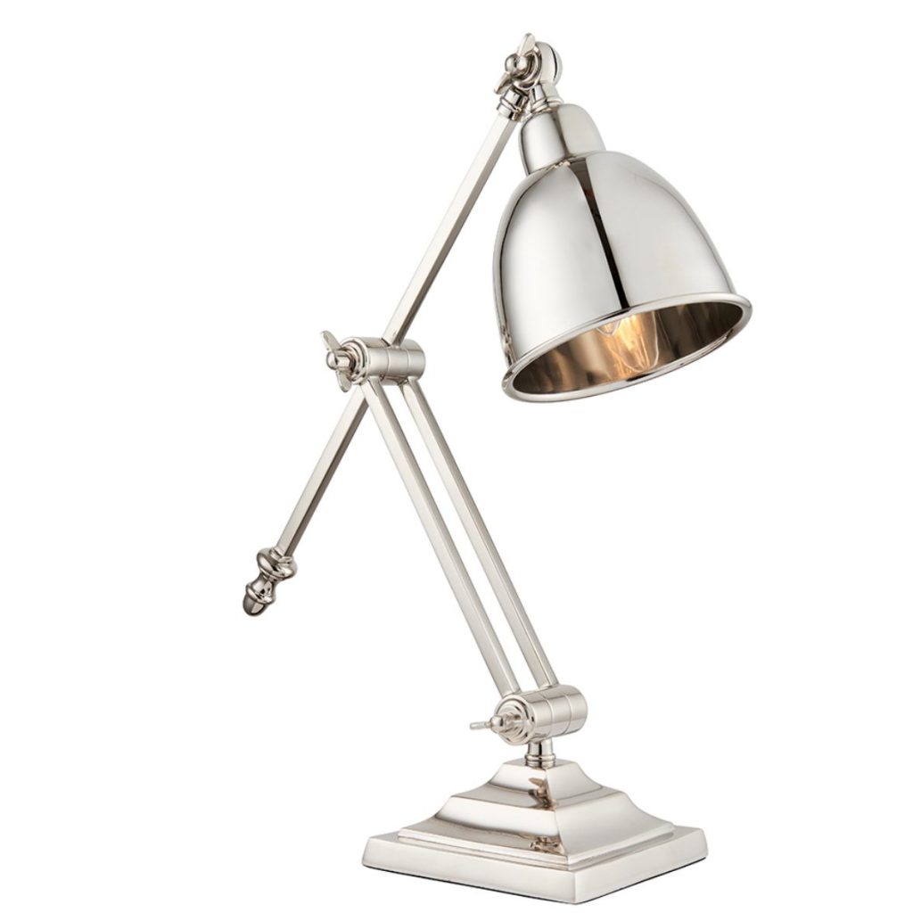 Single light desk lamp with flexible hinges at the top and middle of the slender arm with a dome shaped shade, all in a polished nickel finish. Height adjustable, suitable for use with LED lamps and supplied with inline switch.