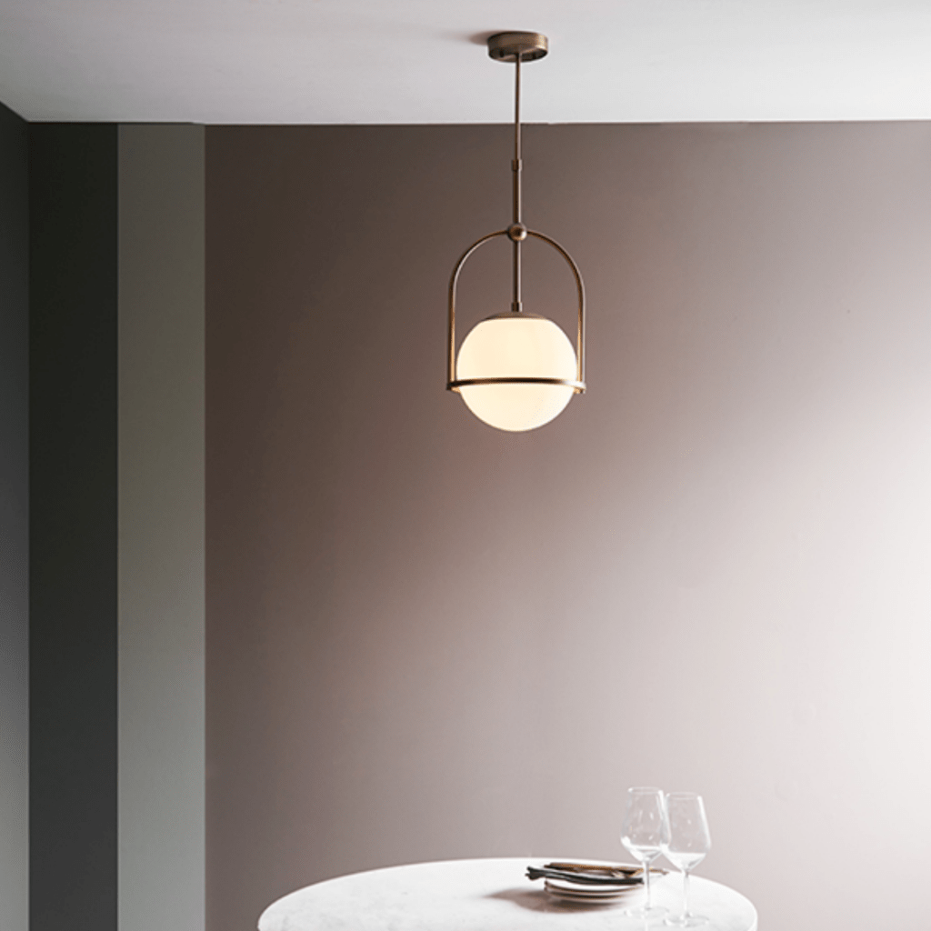 Matt antique brass single pendant with opal glass and adjustable stem.