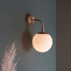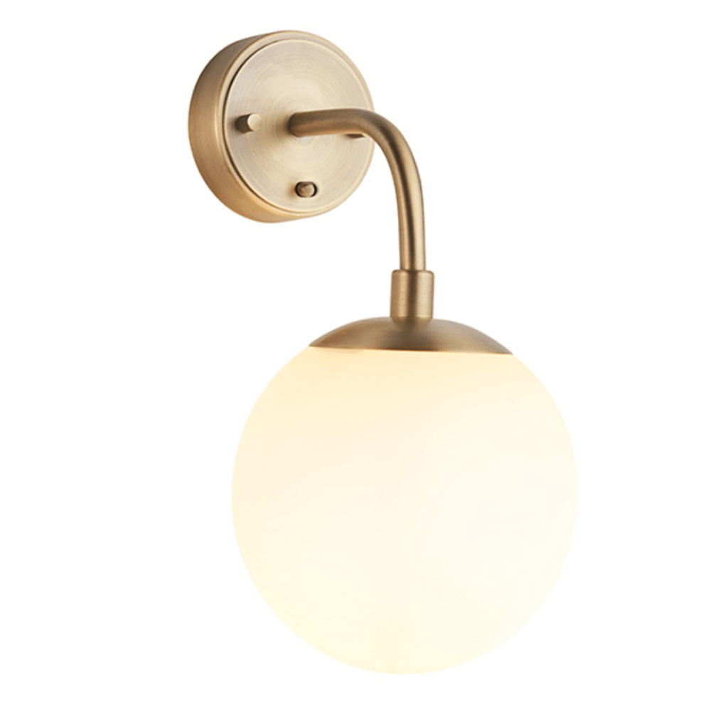 Matt antique brass wall light with opal glass. On/off toggle switch on base.