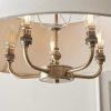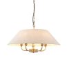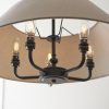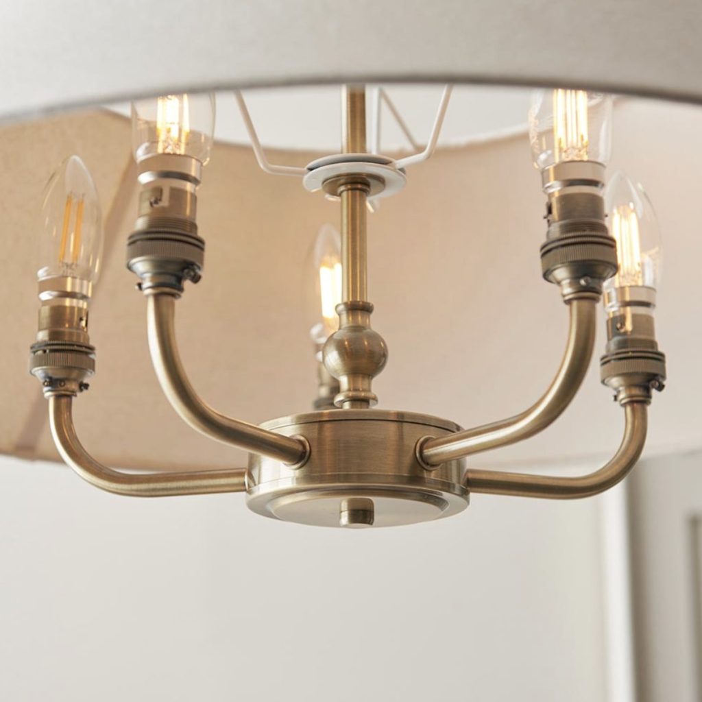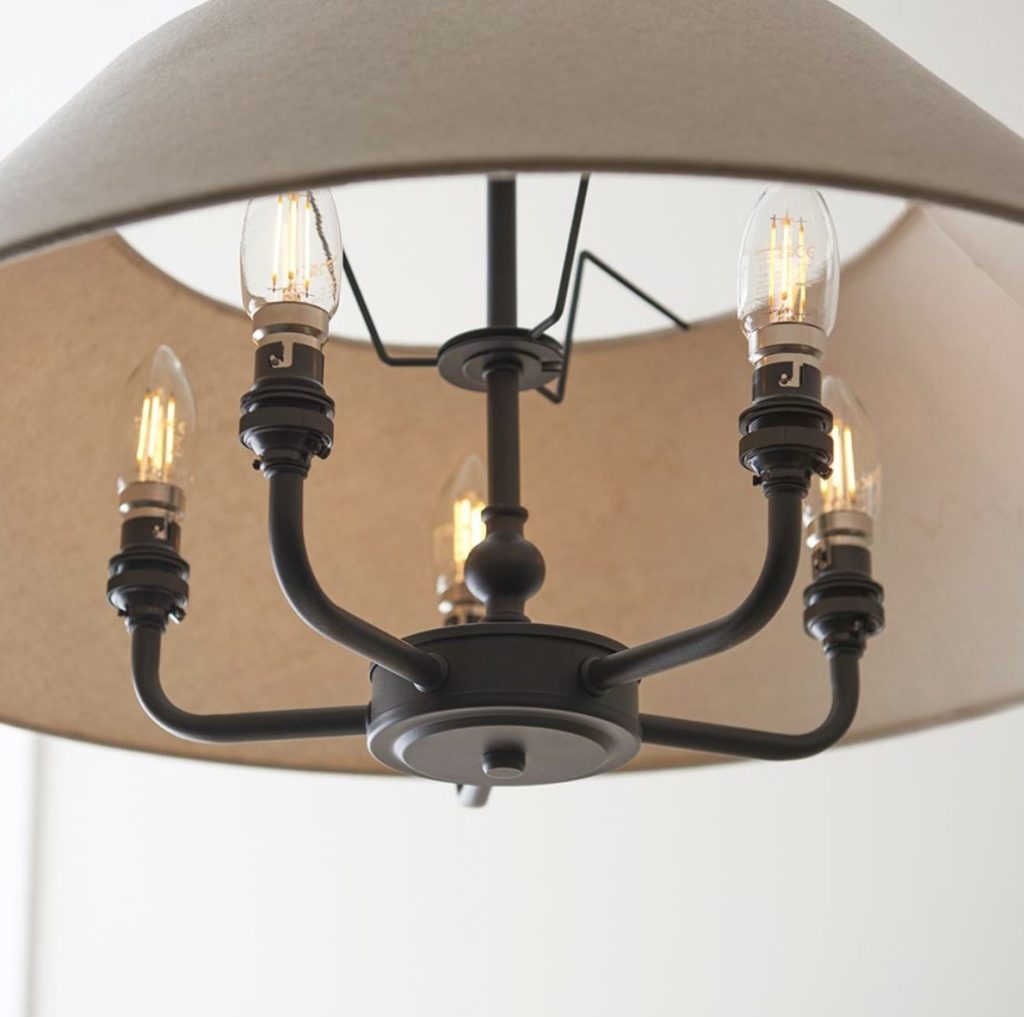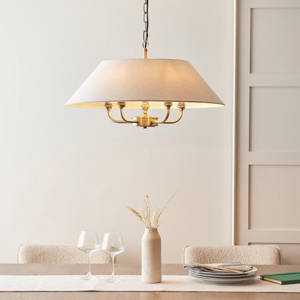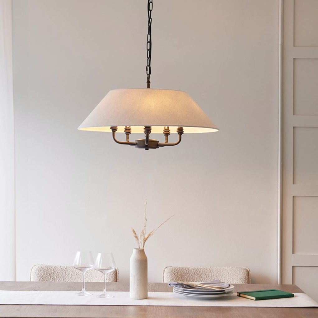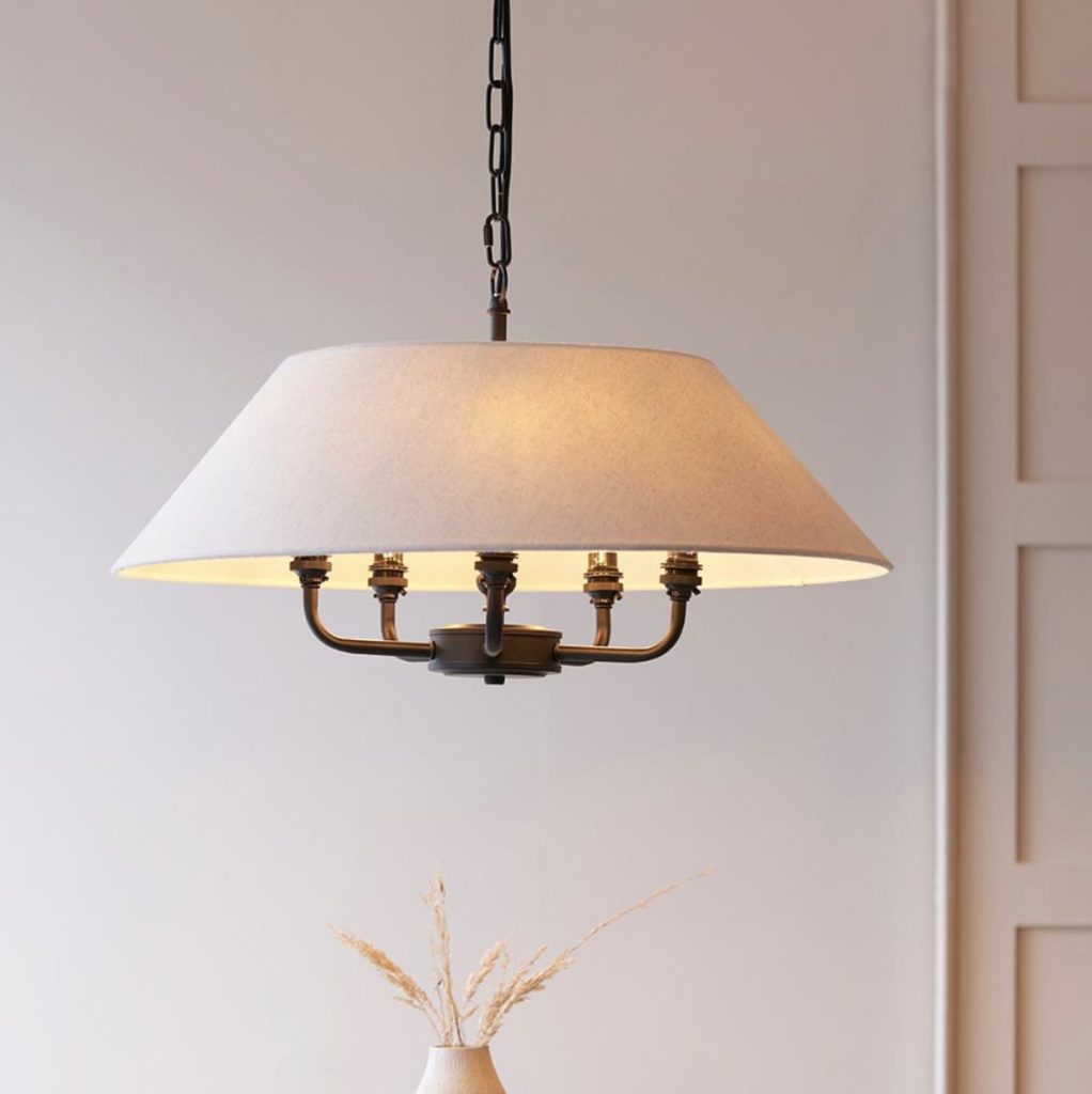 This elegant 5 light pendant is finished in antique brass or matt black and features a timeless tapered shade in natural linen fabric. Complete with B22 lamp holders for an authentic classic look. Matching items available.