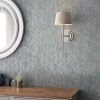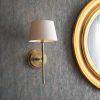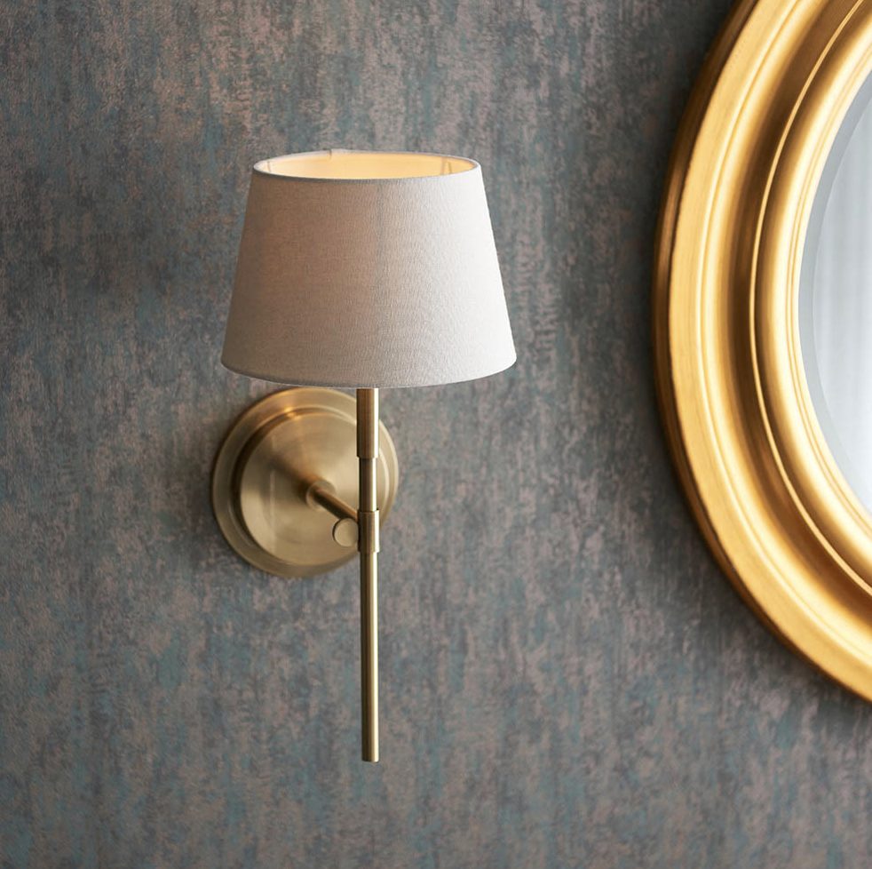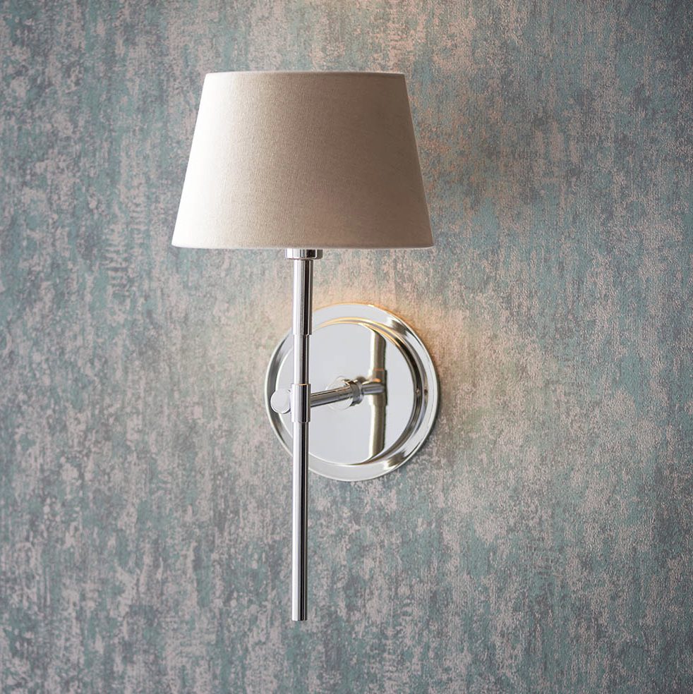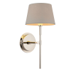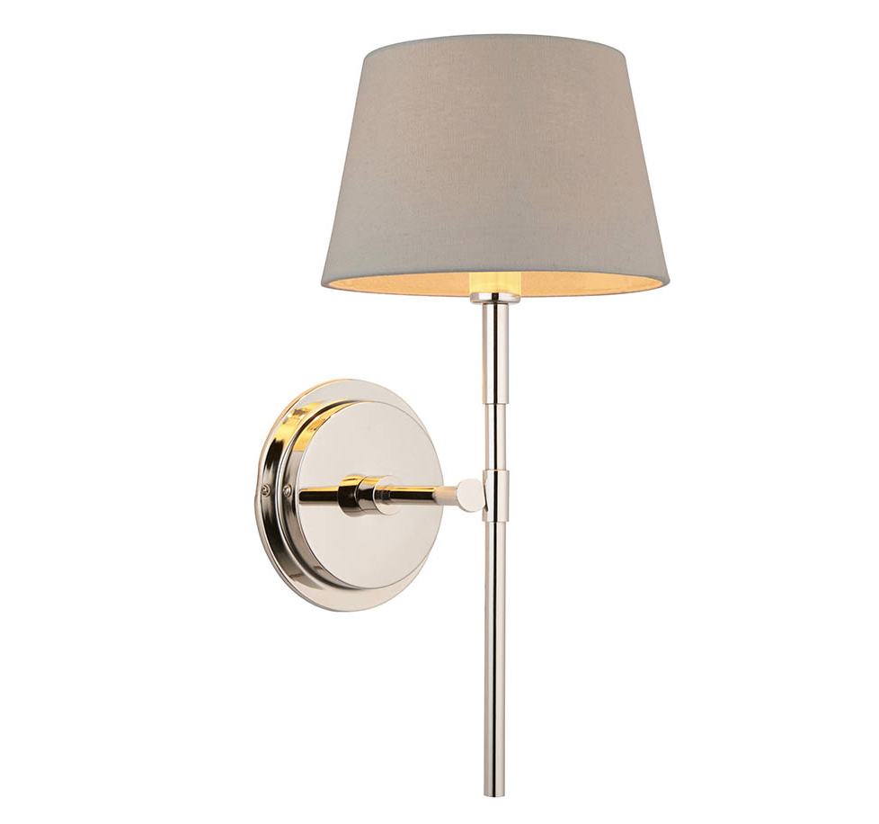 A contemporary take on a classic style in brass or nickel, adorned with an ivory or grey 8 inch tapered fabric shade.