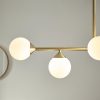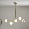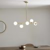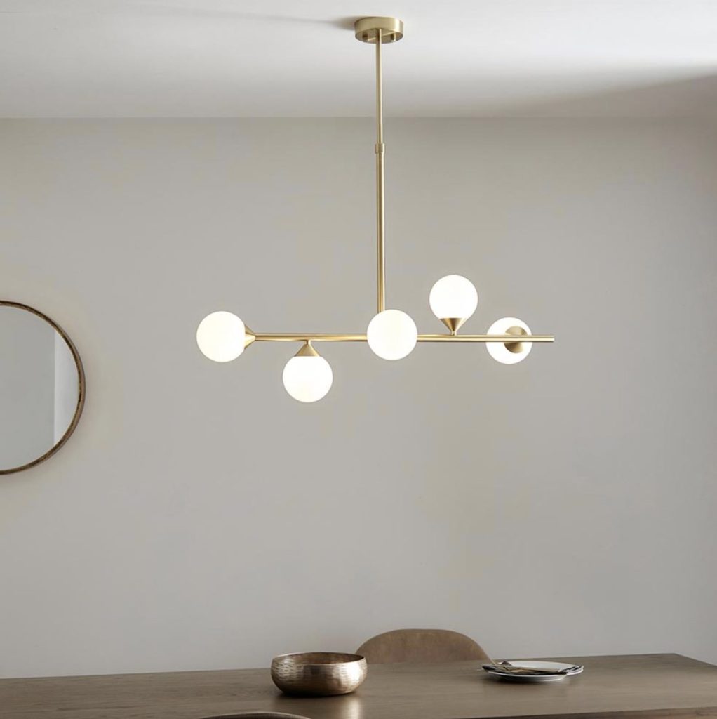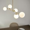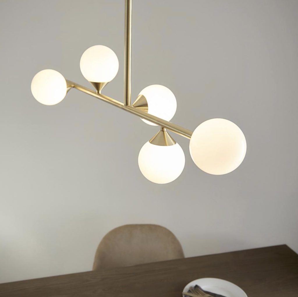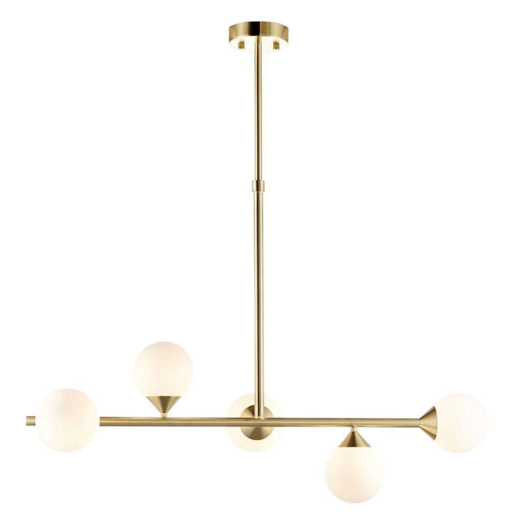 Modern statement 5 light pendant with gloss white glass shades set against satin brass. Ideal for creating a stylish centrepiece in a dining or living room.
