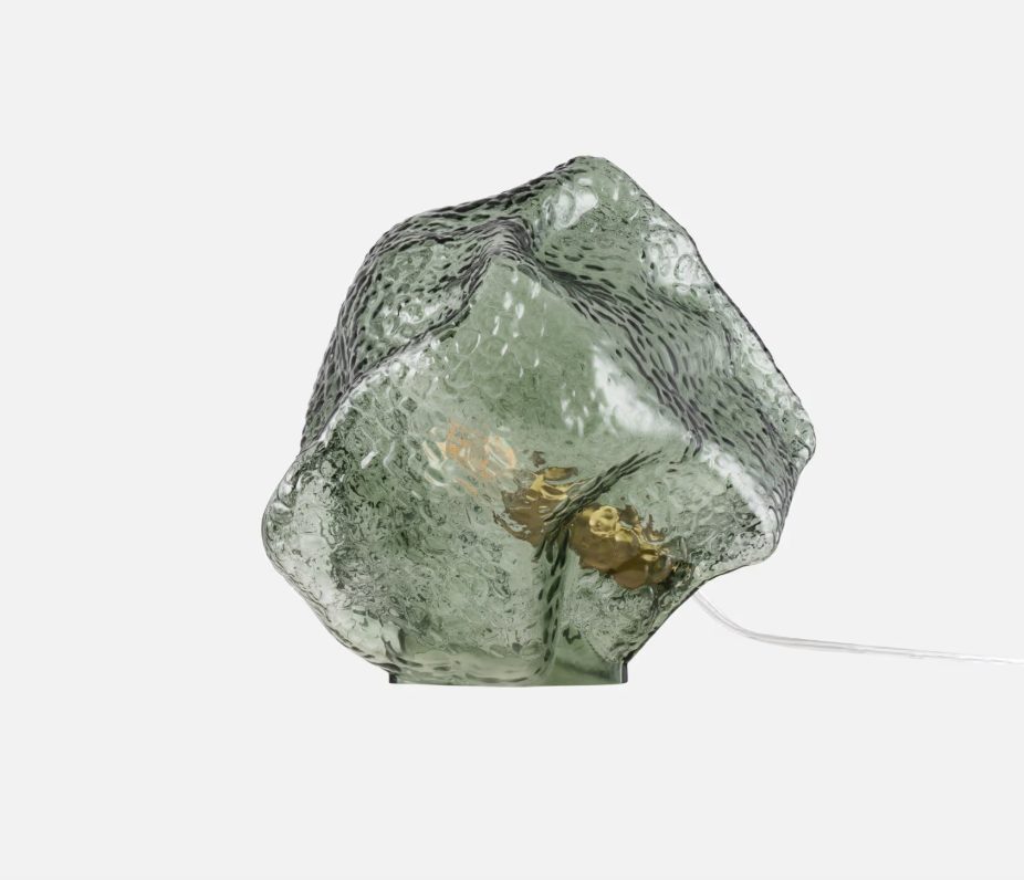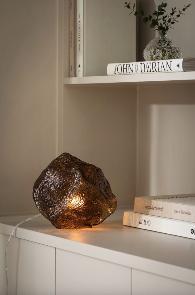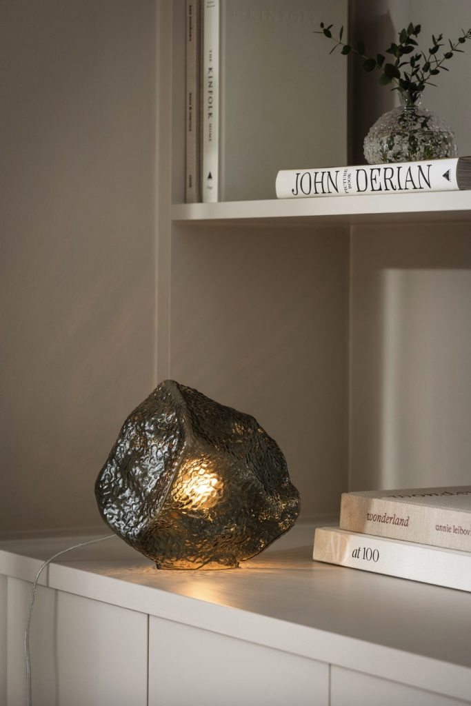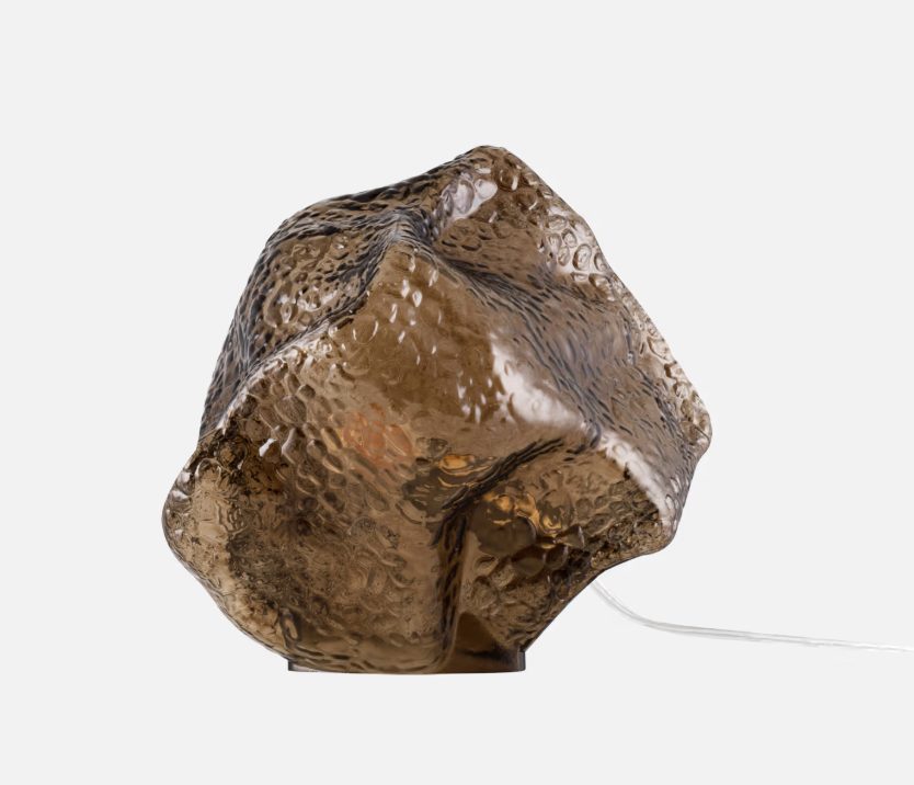 Valerie is a table lamp in the shape of a stone that unites craftsmanship and design. The hand blown glass with its textured surface captures light and creates a lively light play, transforming any room into a warm and welcoming environment. The glass is complemented by details in brushed brass, giving it a classic feel. The lamp has a 200 cm long transparent cable.