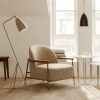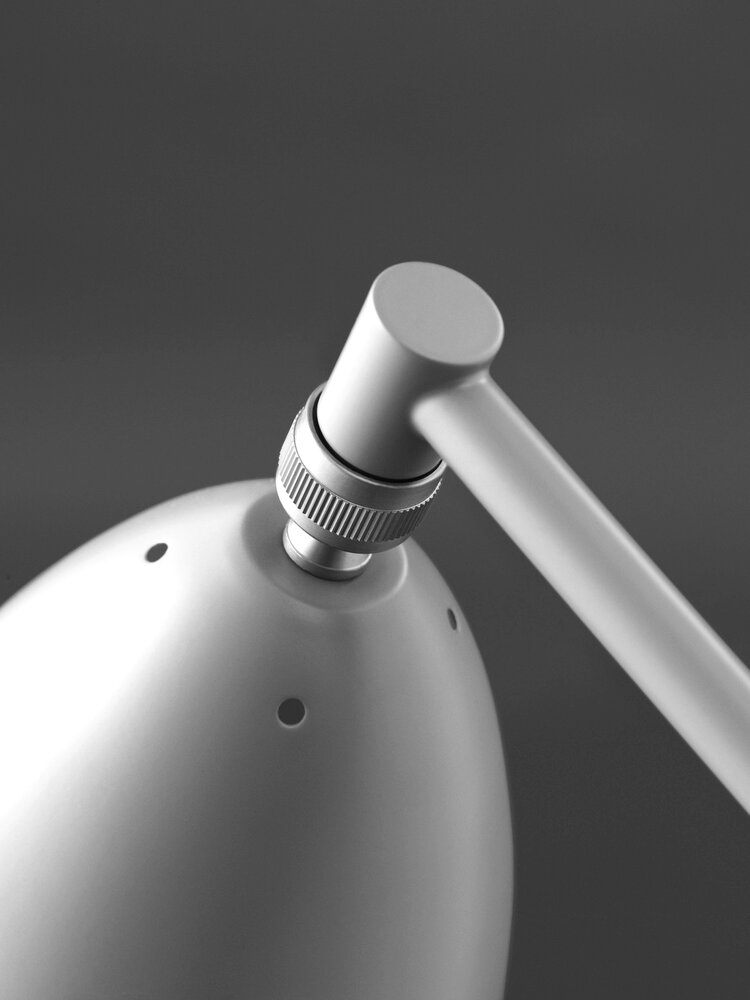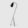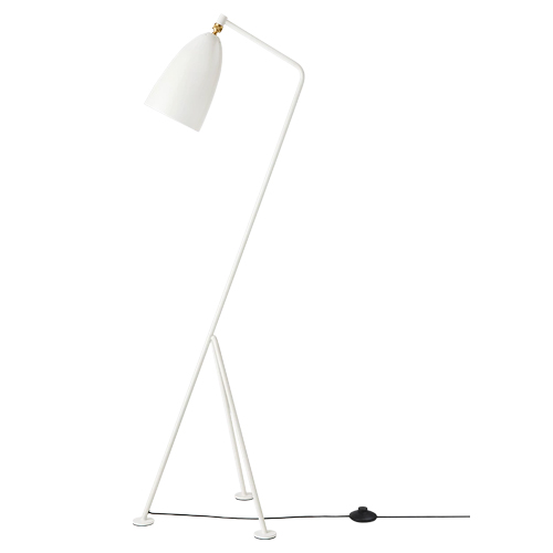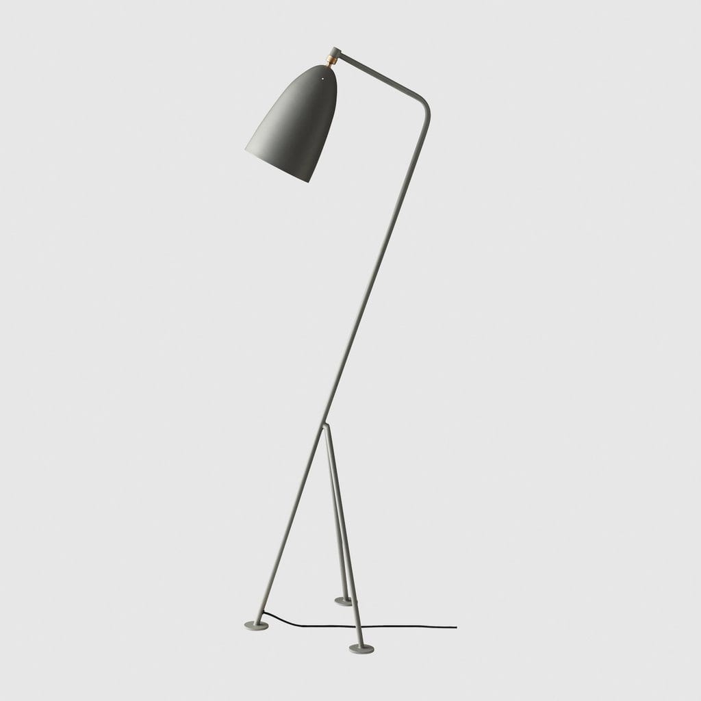 Gräshoppa floor lamp – the tubular steel tripod stand is tilted backward and the elongated aluminium conical shade is ball-jointed onto the arm. Both stand and shade are powder-coated and available in a variety of finishes.