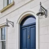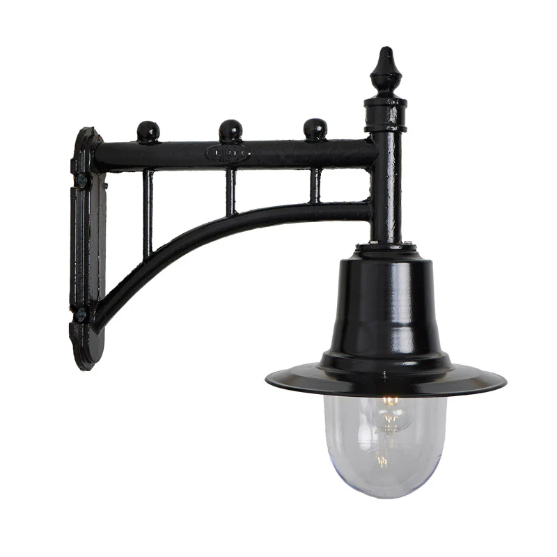 Classic railway style wall light in cast iron and steel 0.62m in height Inspired by the classical and functional features originating from the Georgian era. Allows for maximum lighting spread through the polycarbonate glazing while the ornate capping encloses the light source, reduces light pollution and reflects the light spread downwards.