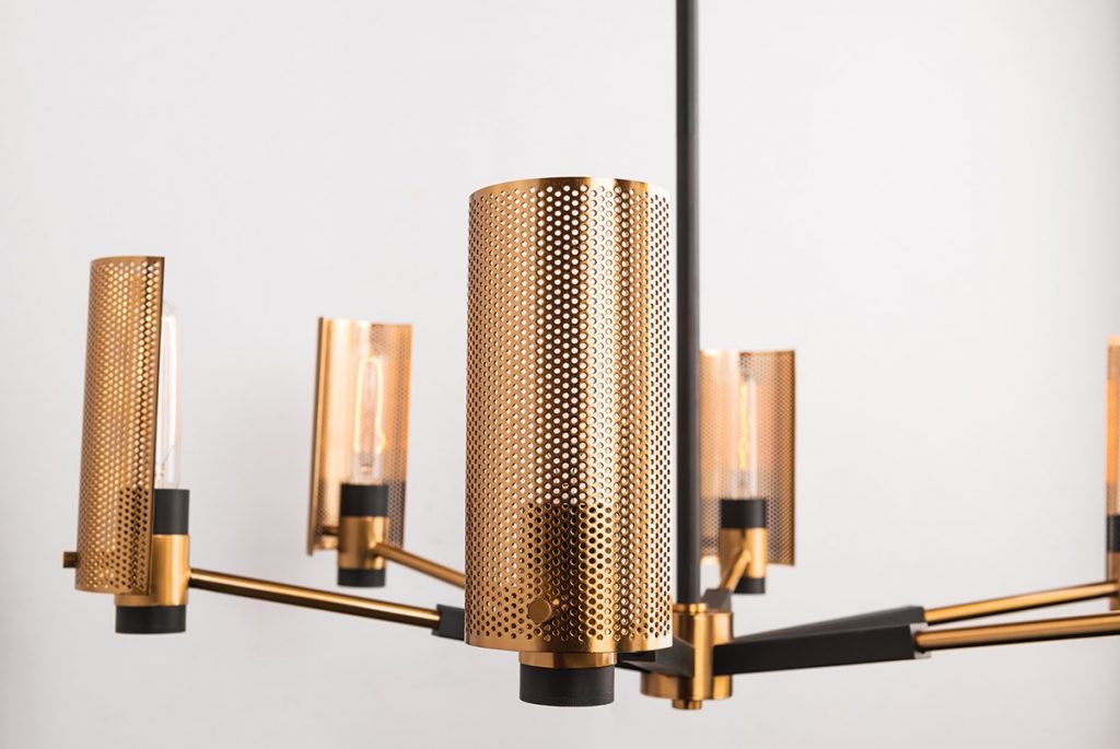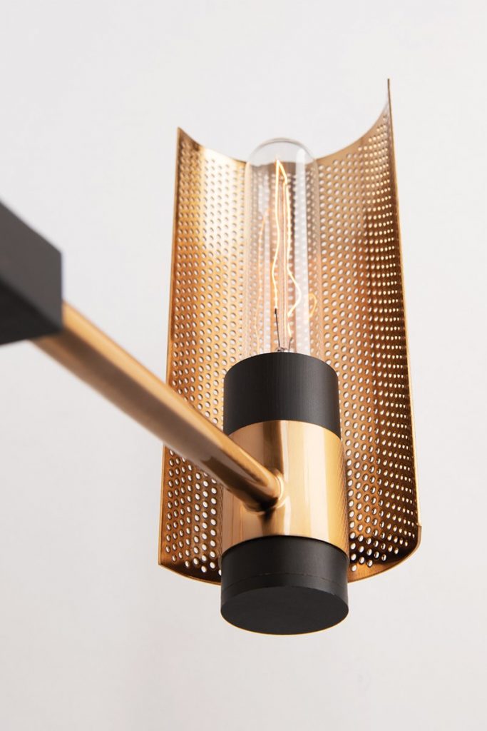 Cradling crackling bulbs, Pilsen’s perforated steel plates finished in brass contrast against a bronze so deep as to be almost black. Further perforations and tactile details unify Pilsen while smooth curves and hard edges add even more visual contrast to this striking, harmonious fixture.
