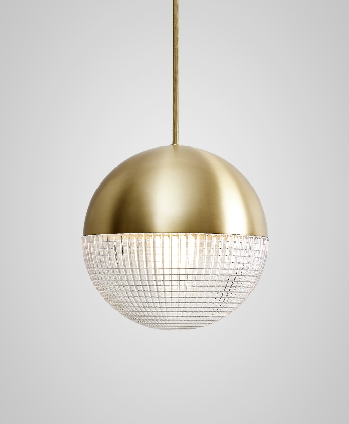Inspired by telescopic lenses and the art of horizontal and vertical refractions, Little Lens Flair is a piece of two halves, seamlessly combining the solid and the transparent. A detailed cross-cut lens emits a soft deflected light, which is juxtaposed by contemporary solid casing in brushed brass or matte black finishes.