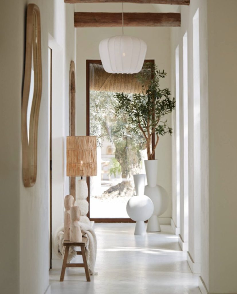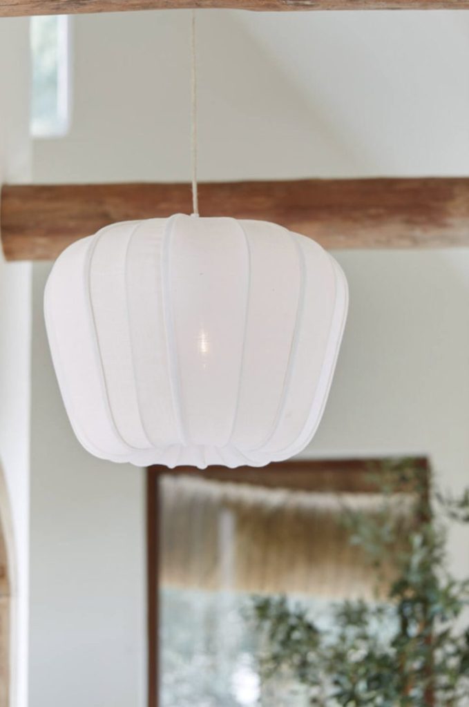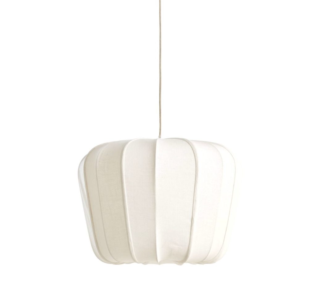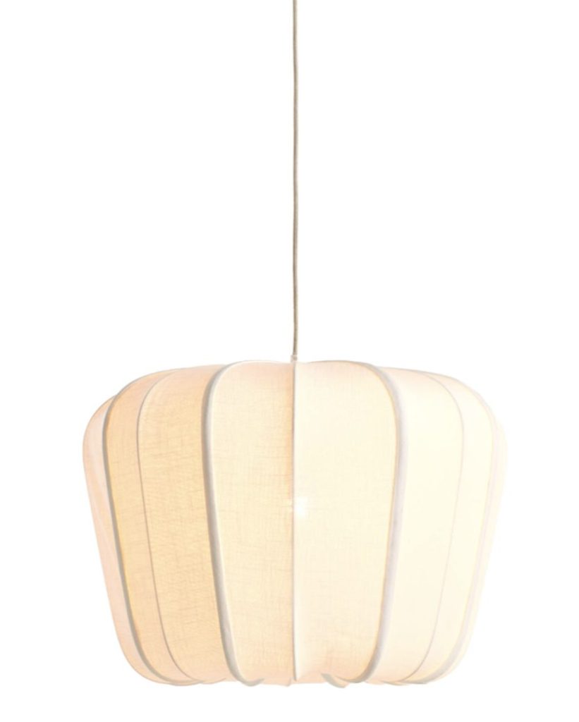Immerse yourself in a warm and inviting atmosphere with the Plumeria hanging lamp. This elegant lamp features a unique shade design, having a soft, white textile draped around a sturdy metal wire frame.