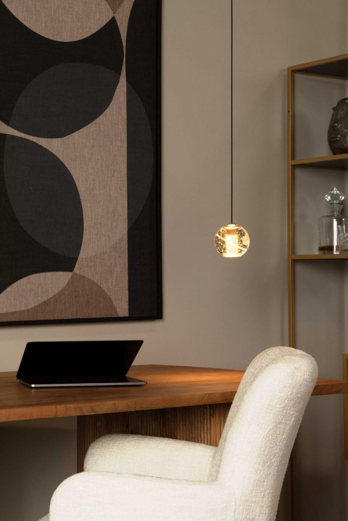 The minimalist design is enhanced by the spherical glass lampshade and its playful and stylish details.