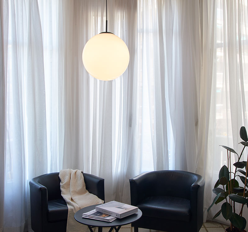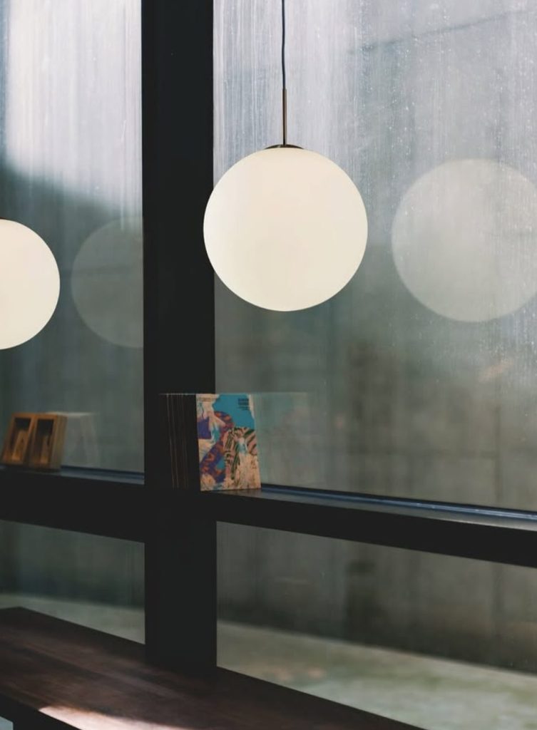 The MOON C. pendant features a glass spherical globe inspired by a timeless classic design.