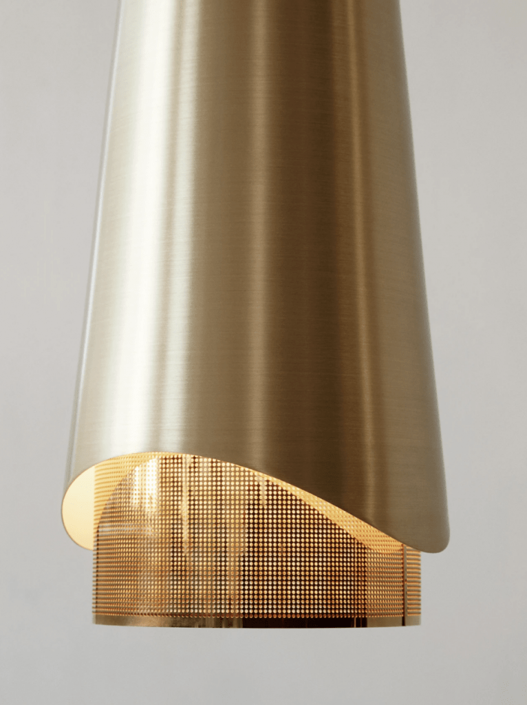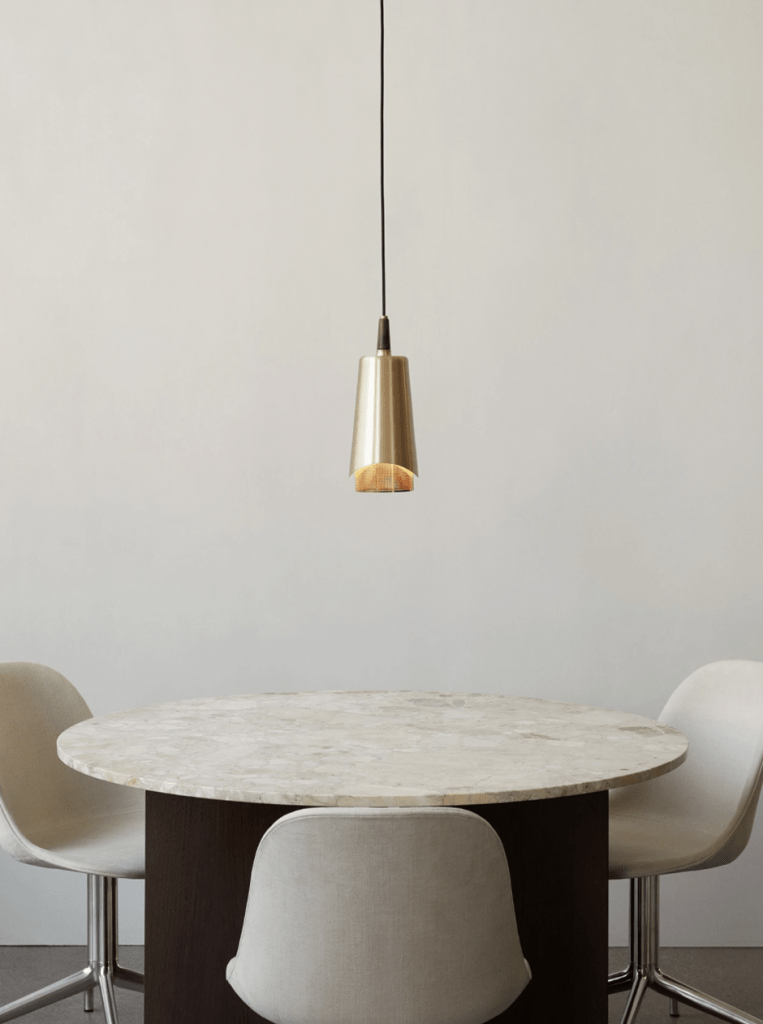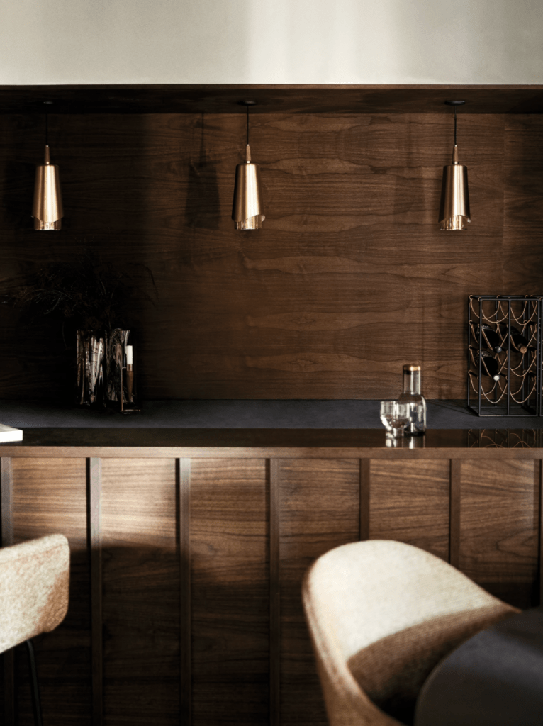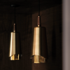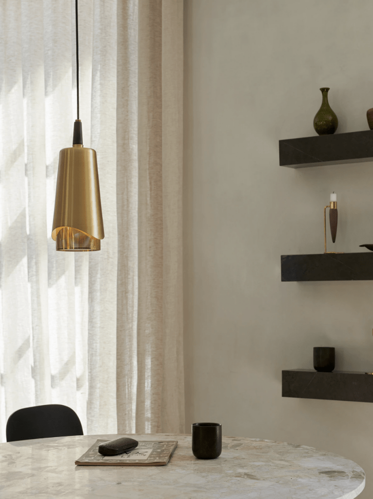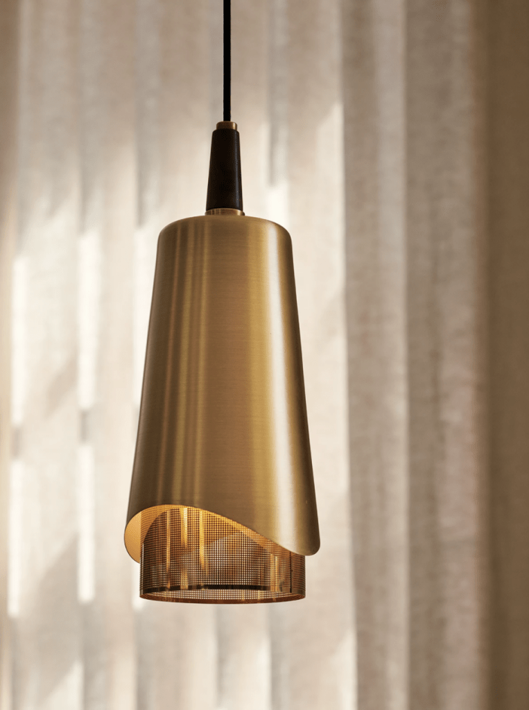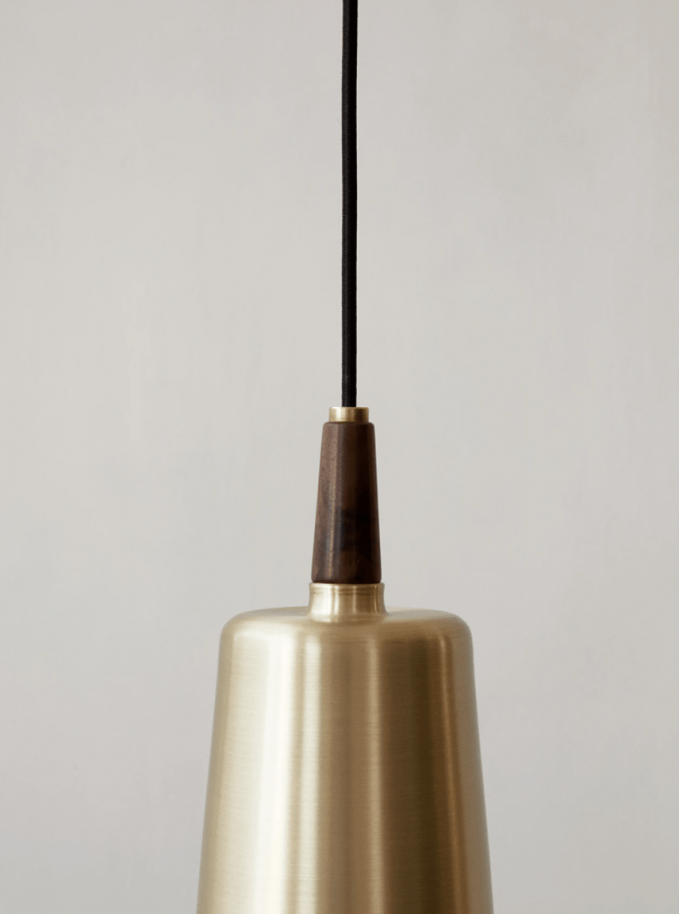 Designed by Arthur Umanoff, this eponymous pendant light shines a light on the contrasts created when perfectly symmetrical, geometric brass and walnut wood components meet. The suspended design emits downward light to illuminate surfaces with its soft and cosy glow.