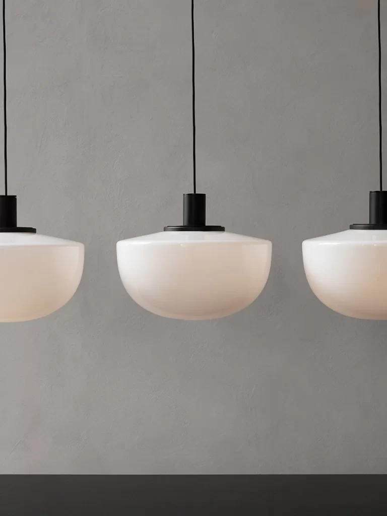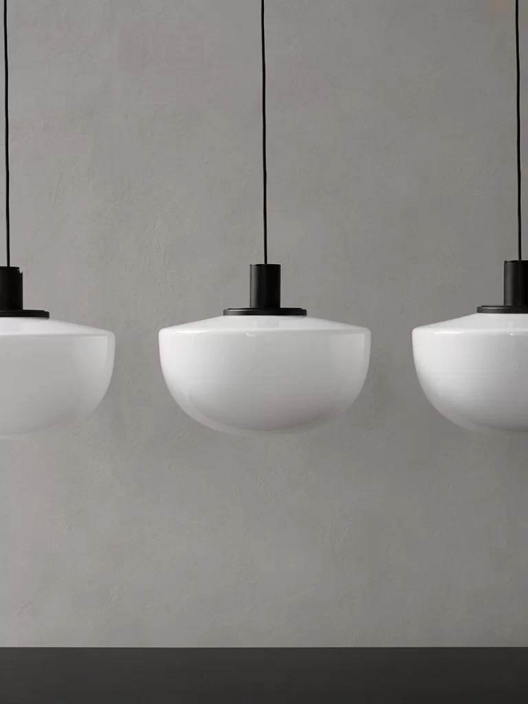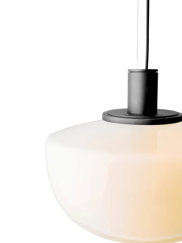 The Bank Pendant is an indoor, semicircular pendant crafted from opal glass and black powder-coated aluminum fittings. The opaque glass gently diffuses 360-degree light from any E26 bulb, creating ambience and providing excellent task lighting. The pairing of opaque glass and fine metal lends the product enduring quality, tactility and longevity. A special fitting with a wire ensures that the unique glass shade can easily be adjusted to hang evenly.