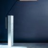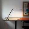 Table LED lamp in extruded aluminum with T-shaped support in polymer filled with glass fibres. Composed of a protruding matt black painted arm where the light source is located and a vertical brass counterweight. The lamp, placed freely on the edge of a surface, oscillates and moves but always returns to the horizontal position. The LED module incorporated in the arm rotates around its own axis, making the lamp versatile providing diffused direct and indirect lighting. Switching on and dimming through a proximity sensor.