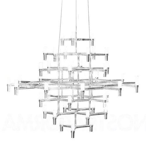 Family composed by pendant chandeliers whose shape is inspired by the outline of the snow crystal. Modular lamps realised with a die-casted aluminium structure and sandblasted glass diffusers.