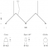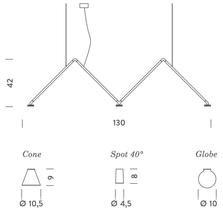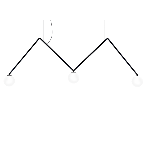 Suspension lamp composed of a slender structure with three light points and diffusers.