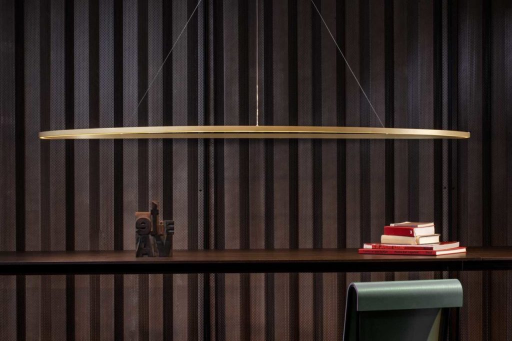 In extruded aluminum, matt lacquered and gold painted. Equipped with an opal diffuser. The lamps are made using a proprietary extrusion coupling technology.