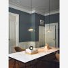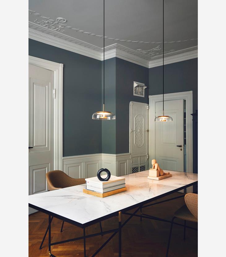 The special-developed LED disc is placed so the light reflects in the mouth-blown glass shade and the golden finish metal, spreading a soft and sophisticated, indirect light.