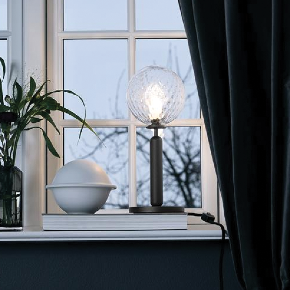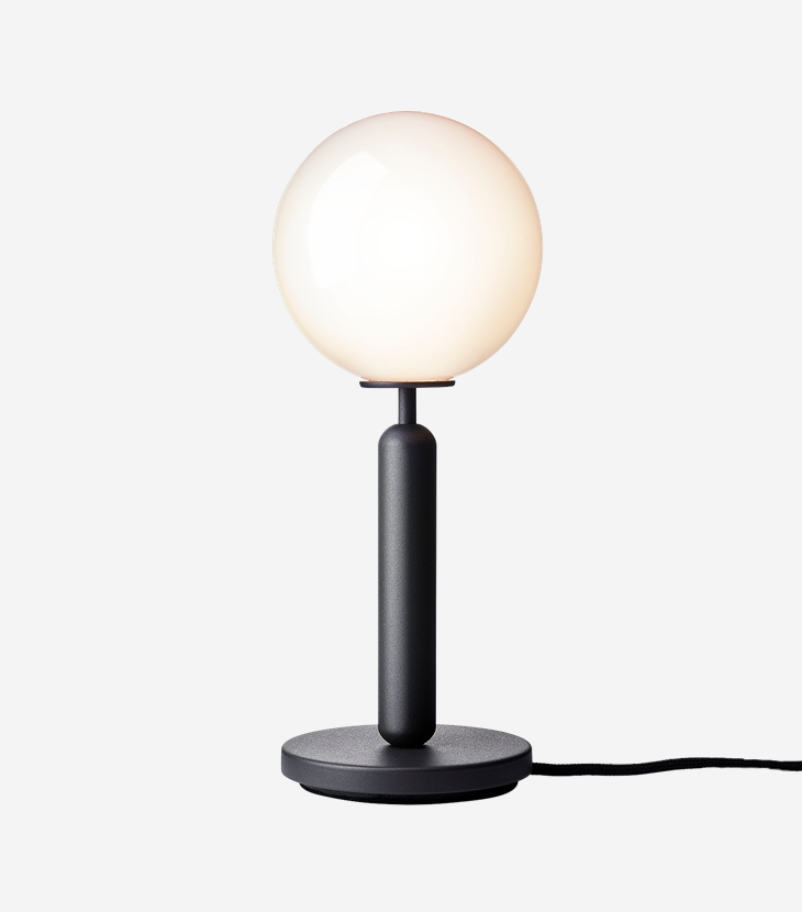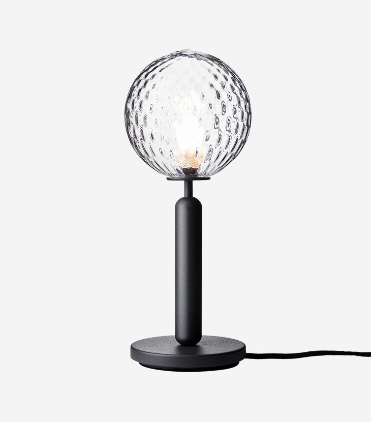 Miira Table Lamp with Optic or Opal glass. Powder coated metal. Mouth-blown glass. Fabric covered cable