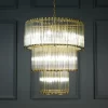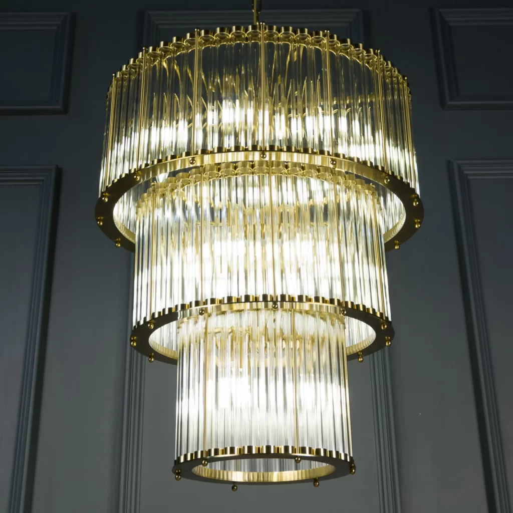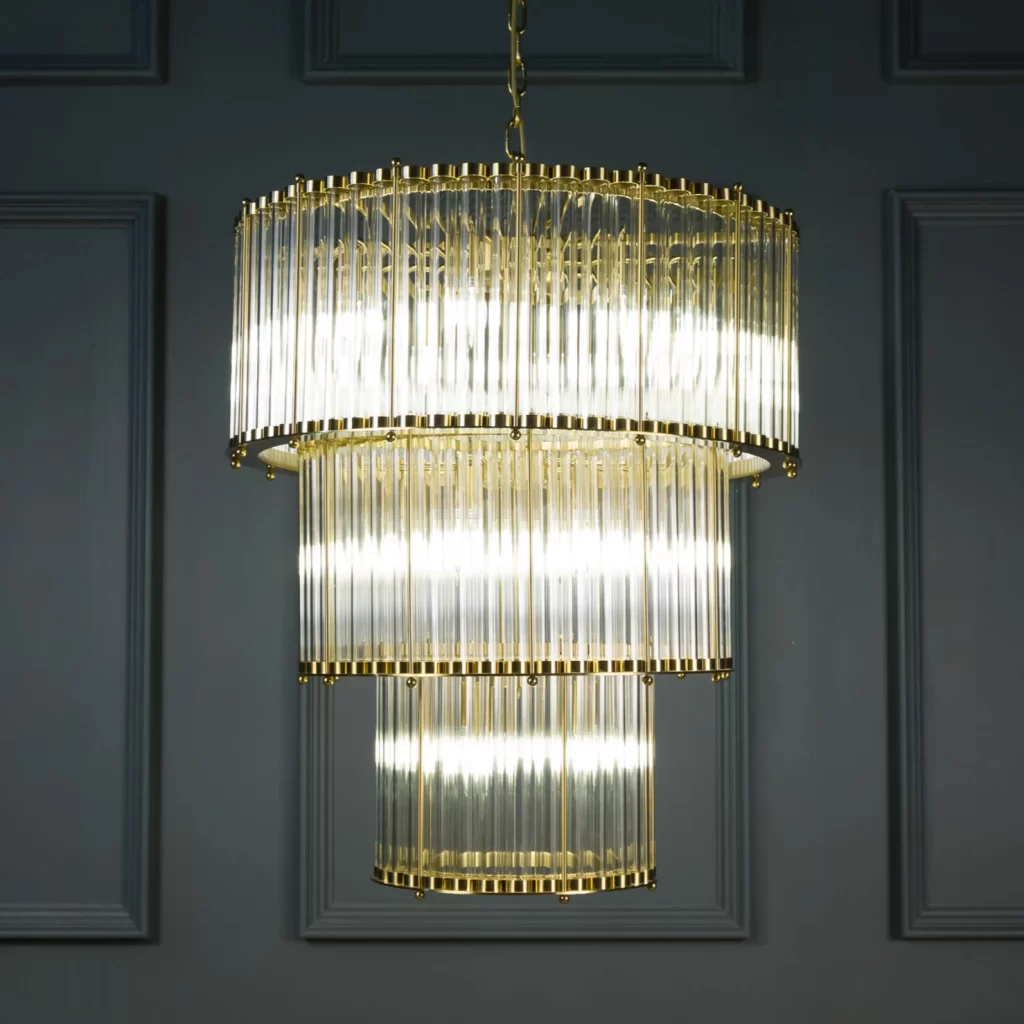 The Triple Monza chandelier features three layers of clear glass tubes with brass finish metalwork. This is the largest of the Monza collection and a spectacular centrepiece. It has hints of Art Deco glamour but would suit any interior, wherever you decide to hang it.