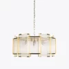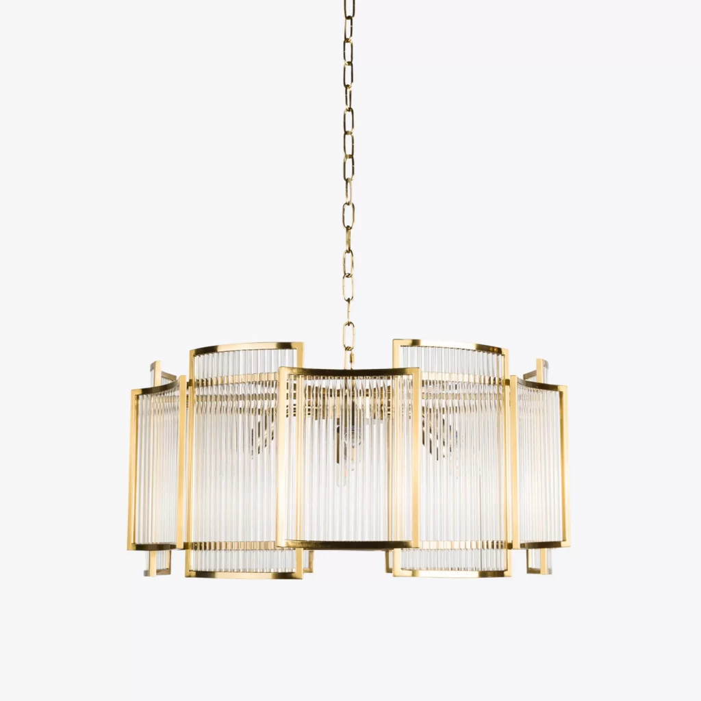 The large Monte Carlo chandelier features brass finished metalwork, enclosing clear glass rods to create a timeless look suitable for contemporary and traditional interior schemes. The perfect addition to a living or dining room.