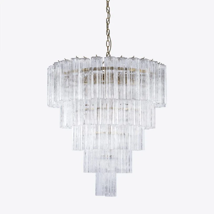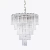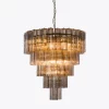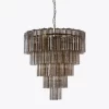 Five tiers of fluted glass tubes create this beautiful mid-century inspired chandelier. The textured glass tubes are individually hung from a Satin Brass frame. This style is available in three colours; a rich, sophisticated Smoked Quartz, a fresh blush Pink or clear glass.