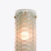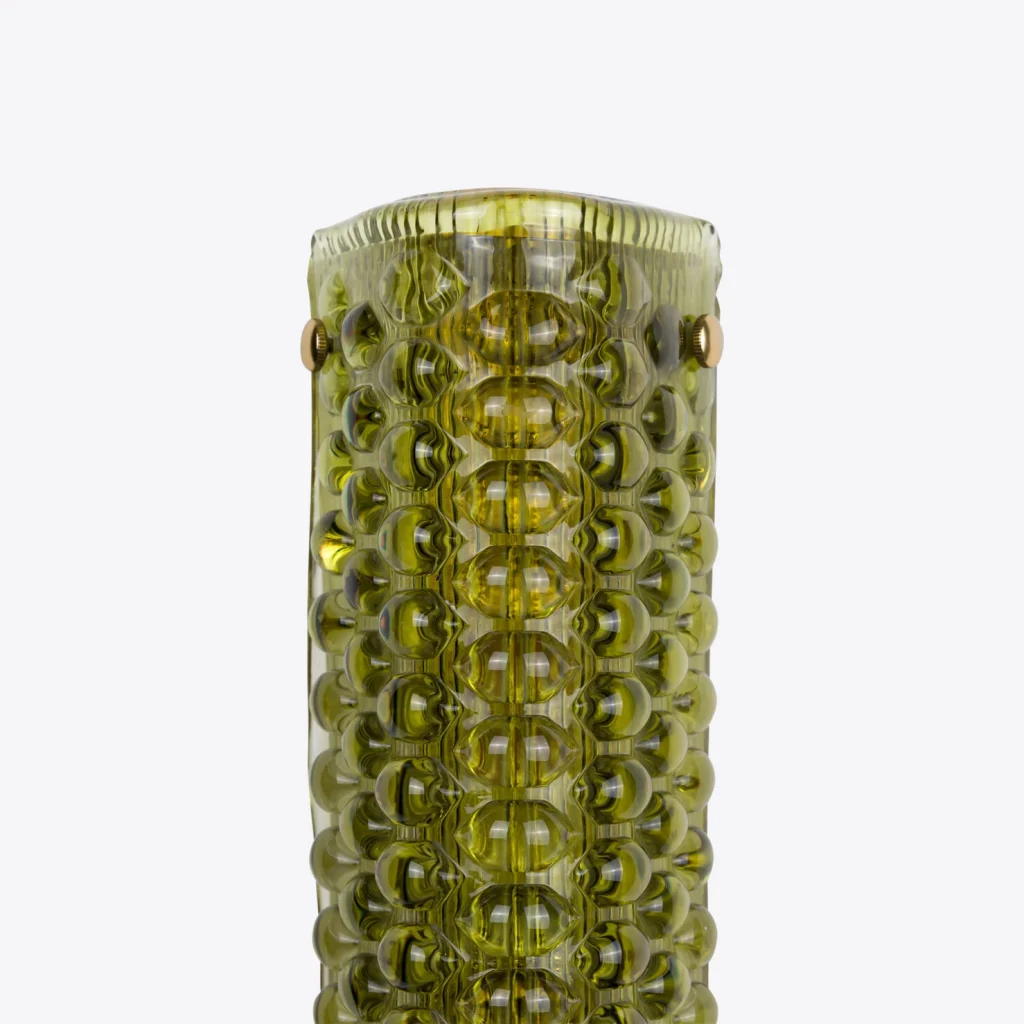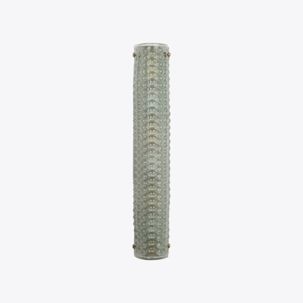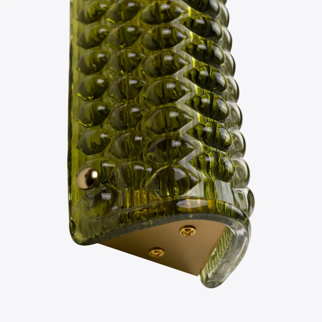Illuminate your space with this sleek, elegant wall light inspired by Italian midcentury modern design. This lighting fixture exudes sophistication and charm, featuring a unique textured dark or sea green moulded glass with stunning hues.