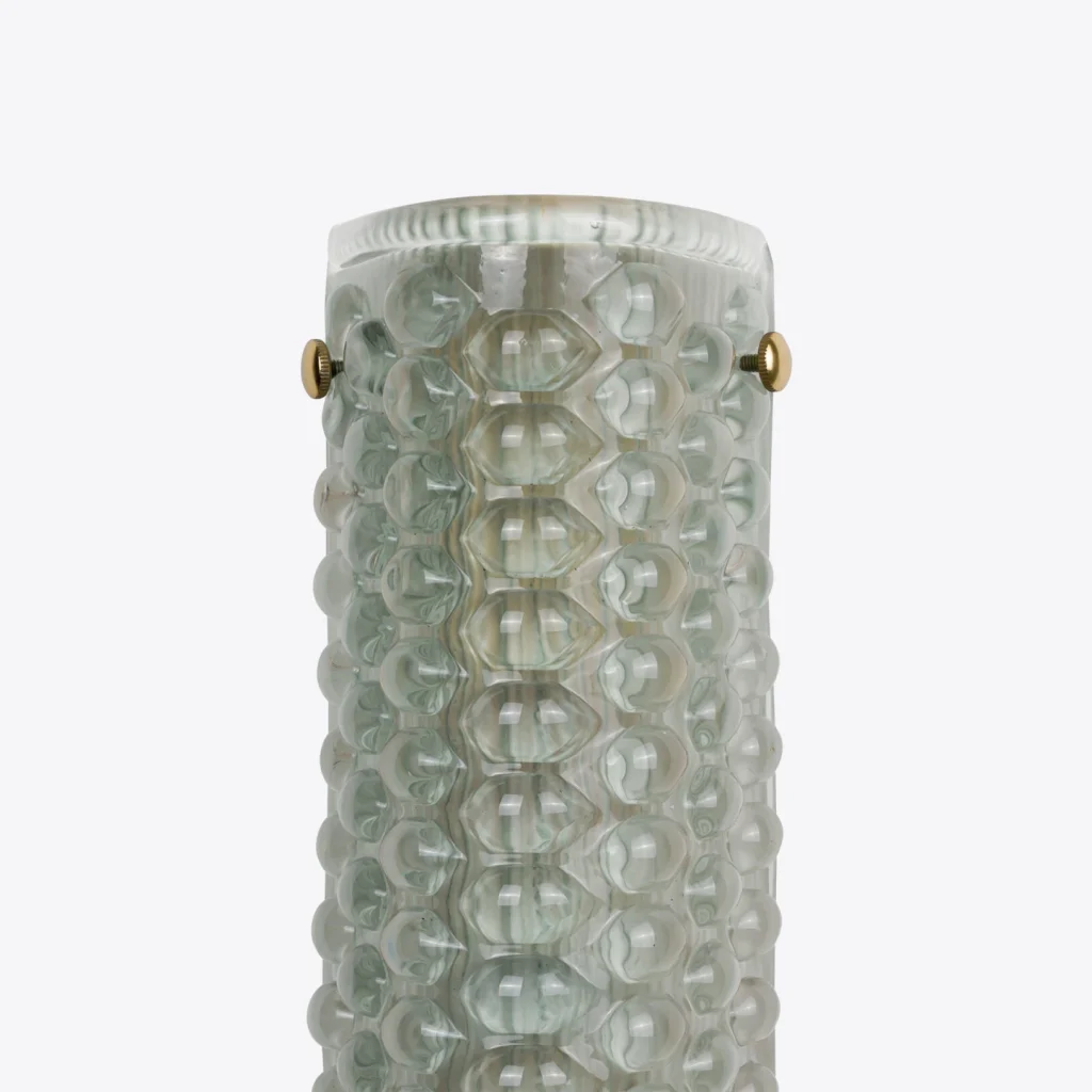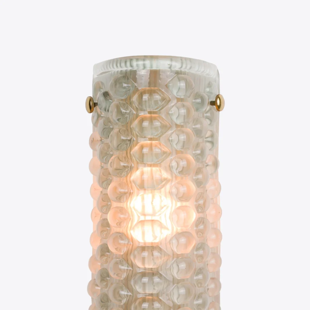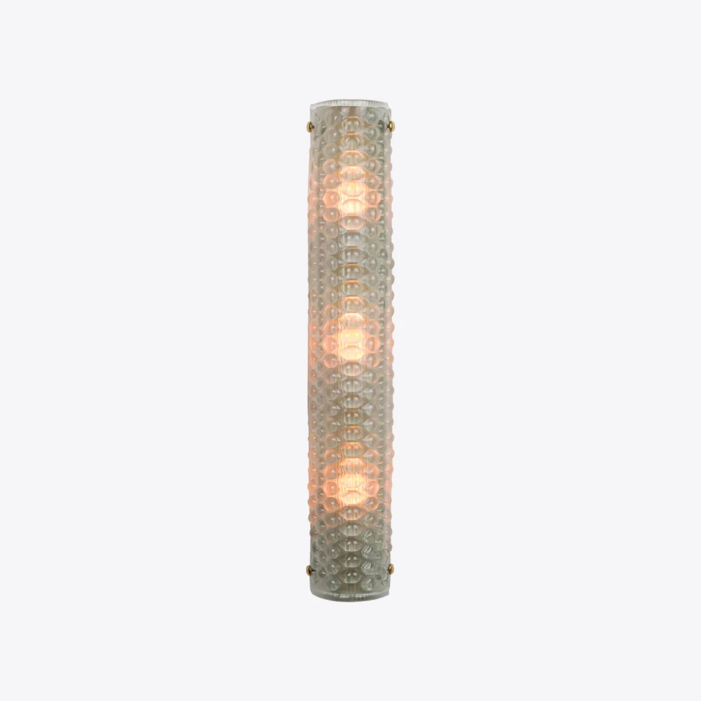 The elongated design and subtle brass screw-in bolt accents add to its sleek design and craftsmanship. It is the perfect choice for hallways, living rooms or bedrooms, adding a touch of vintage-inspired luxury while providing a warm, ambient glow. It is a true blend of artistry and functionality for any modern interior.