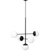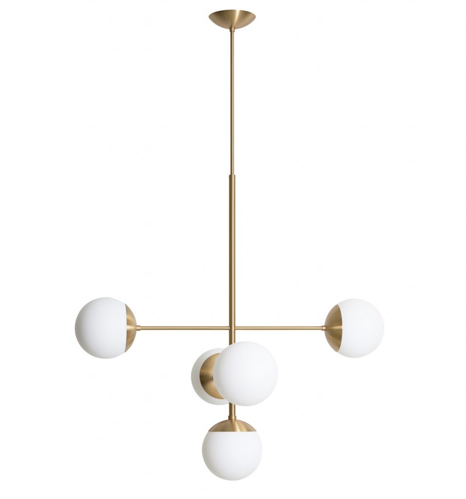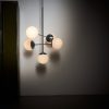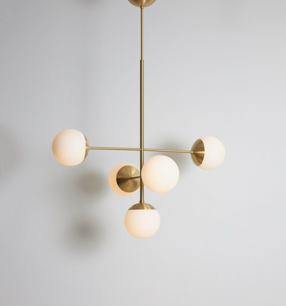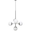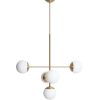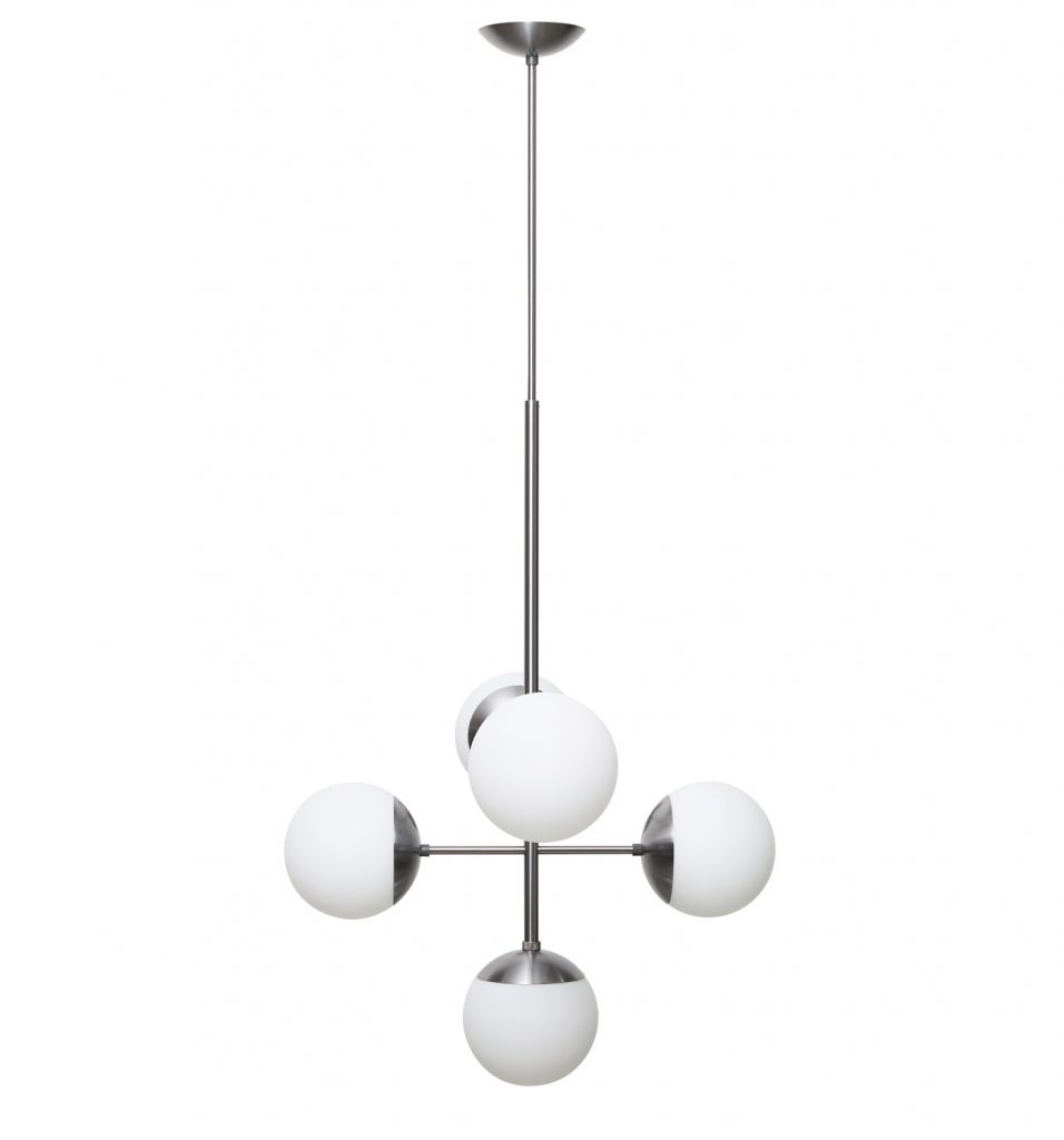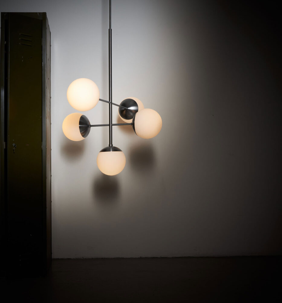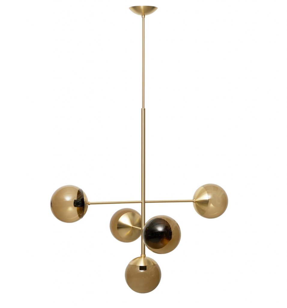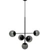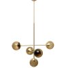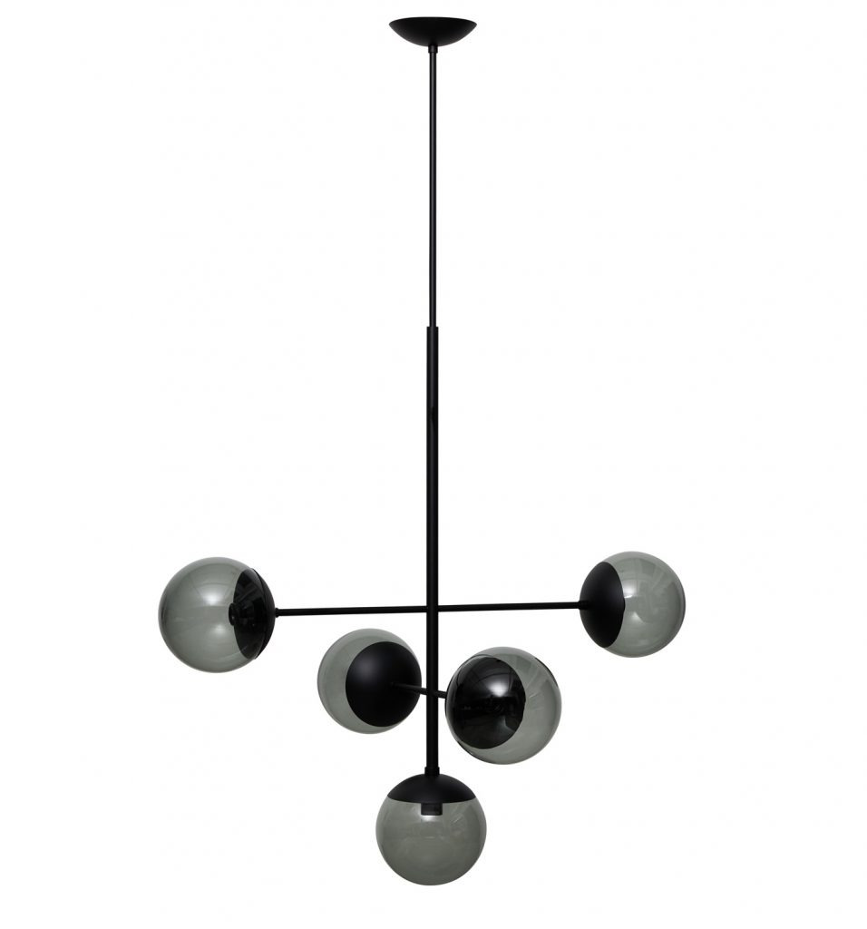 Globes of blown glass – The metal parts of the luminaire are made of iron and steel or brass and are all lacquered. E27 Bulbs included. Smoked Glass: 5 x 4W LED, Brown Glass: 5 x 4W LED, Opal Glass: 5 x 8.5W LED.