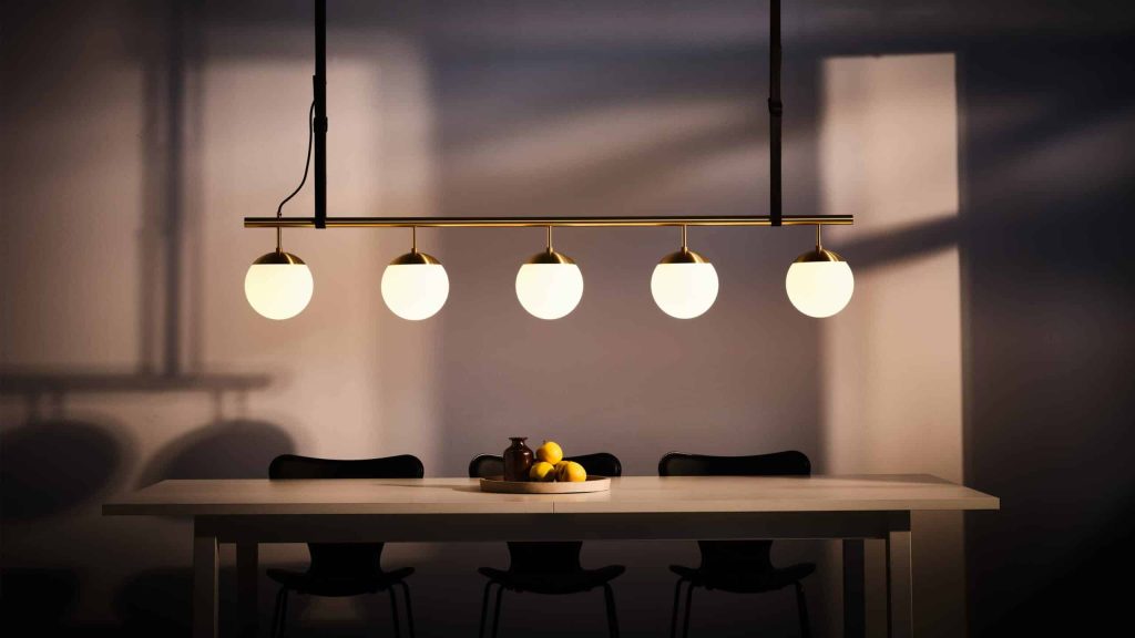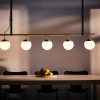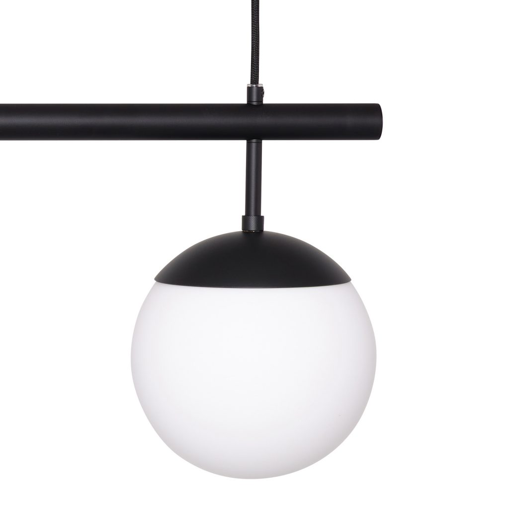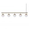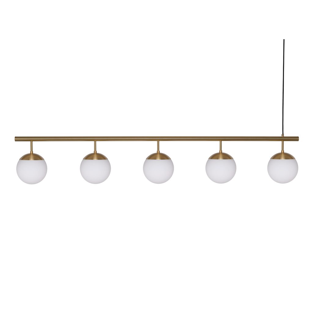 The Long Lord 5 Pendant lamp is made from a 1800mm rod of iron or brass. The glass globes have a diameter of 200mm and are either opal, smoked or brown, depending on which version you choose. All brass parts are brushed and the black lacquered version is made of iron. Black textile cord. Bulbs included.